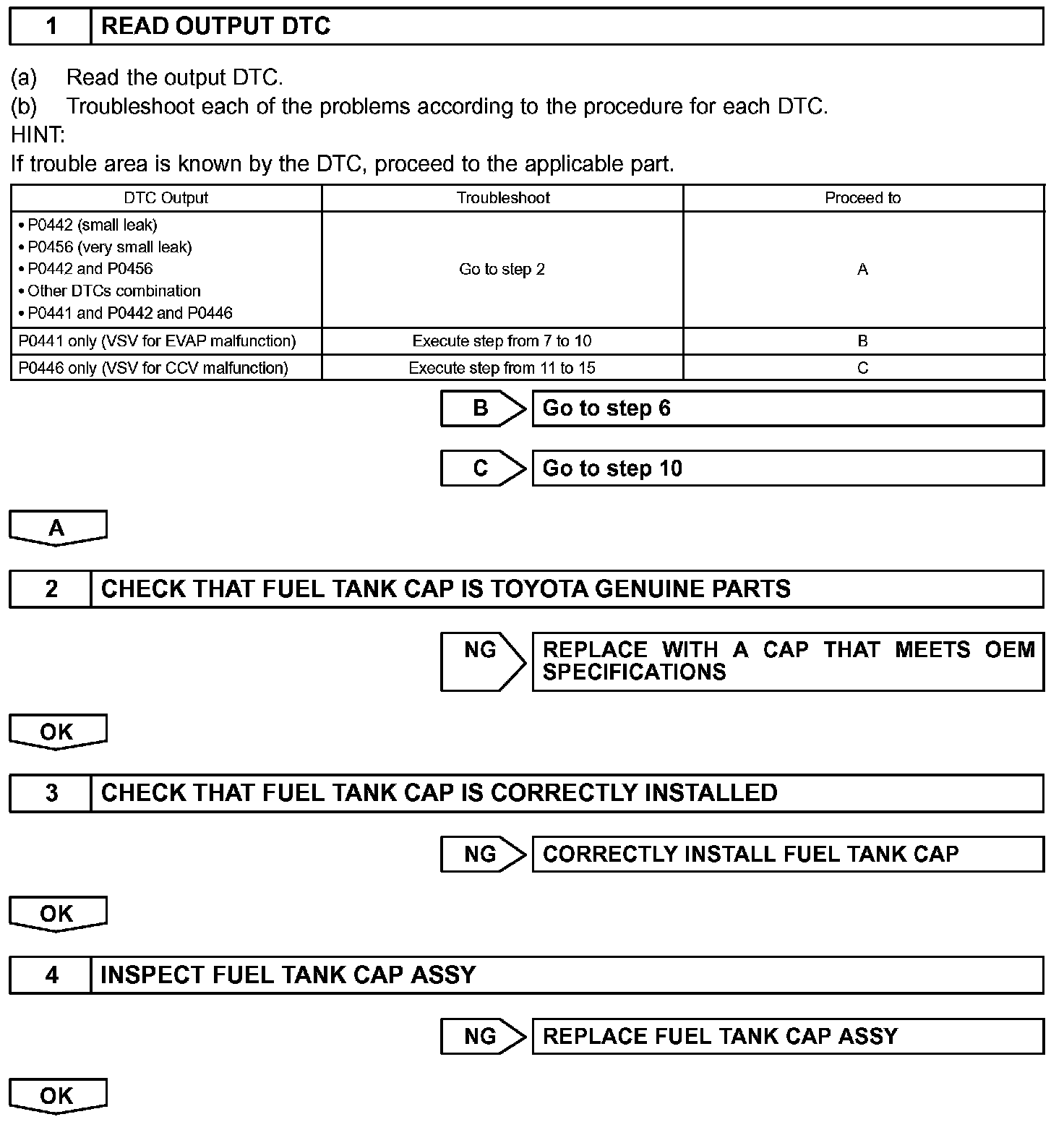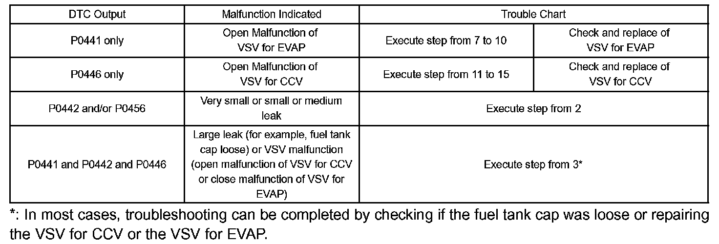 - If DTC P0441 (Purge Flow), P0446 (VSV for CCV), P0451, P0452 or P0453 (Evaporative Pressure Sensor) is output with DTC P0442 or P0456, first troubleshoot DTC P0441, P0446, P0451, P0452 or P0453. If no malfunction is detected, troubleshoot DTC P0442 or P0456 next.