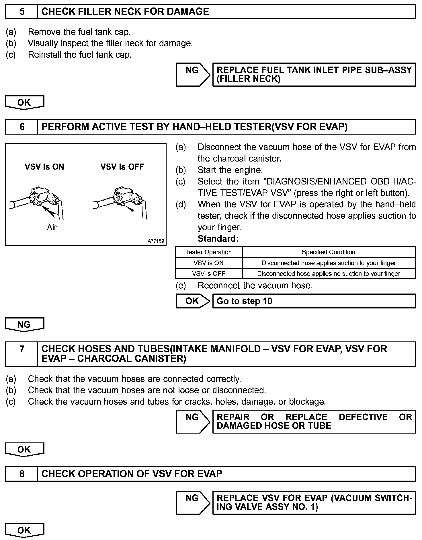 The VSV for CCV is open under normal operating conditions. When the VSV for EVAP is used to purge the evaporative emissions from the fuel tank into the intake manifold, fumes are drawn from the fuel tank into the charcoal canister. The VSV for CCV has an additional function that relieves the pressure when the pressure inside the fuel tank has rapidly increased. Finally, the VSV for CCV is used in unison with the VSV for EVAP to create a vacuum inside the fuel tank and leak tests are performed using this vacuum.