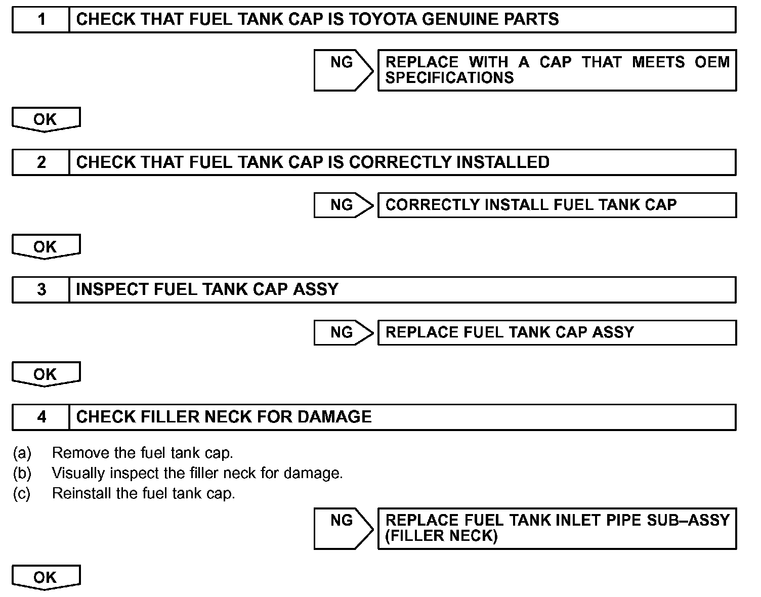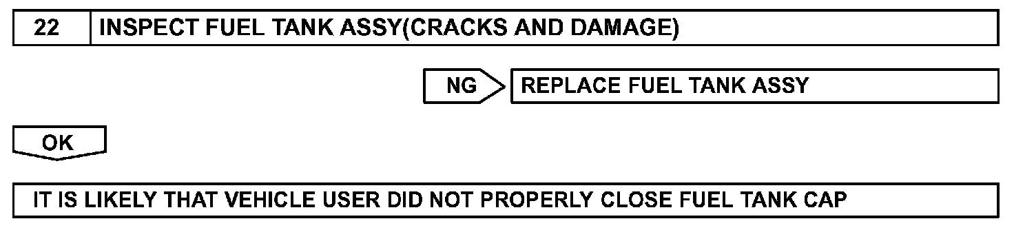 - Ask the customer whether, after the MIL came on, the customer found the fuel tank cap loose and tightened it. Also ask the customer whether the fuel tank cap was loose when refuelling. If the fuel tank cap was loose, it was the cause of the DTC. If the fuel tank cap was not loose or if the customer was not sure if it was loose, troubleshoot according to the following procedure.
