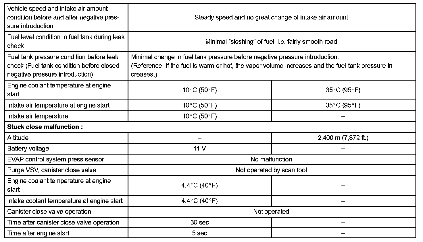 The ECM checks for a VSV for CCV "stuck closed" malfunction by commanding both valves (VSV for EVAP and VSV for CCV) open at a time when the fuel tank is at atmospheric pressure. If the fuel tank develops a high negative pressure (vacuum) and it remains in that state for more than 4 seconds, the ECM determines that the VSV for CCV (vent) is stuck CLOSED. The ECM will turn on the MIL and a DTC is set. This malfunction is detected regardless of the engine coolant temperature.