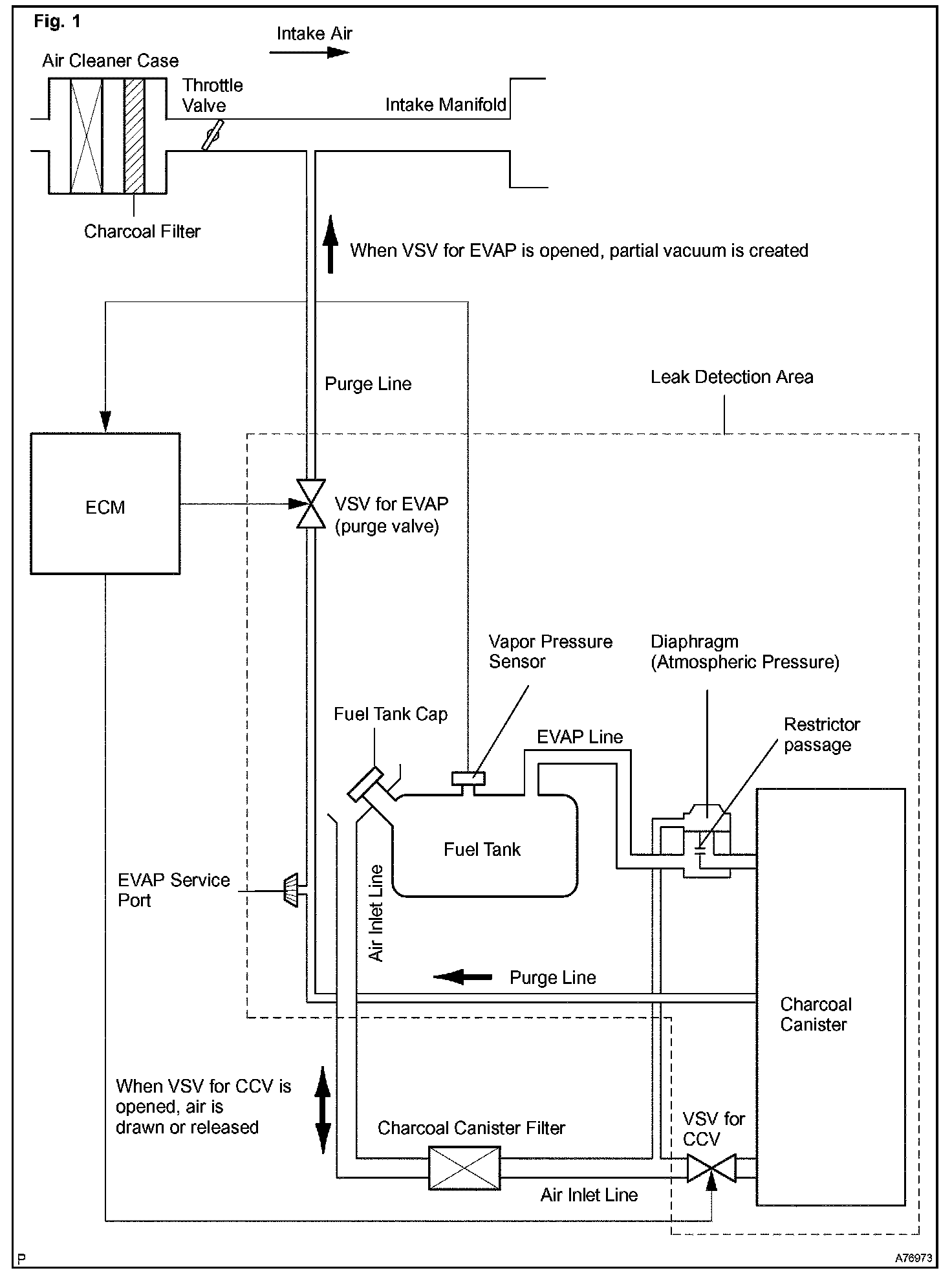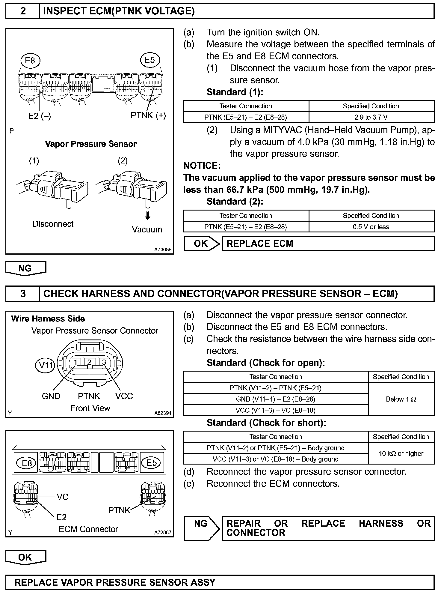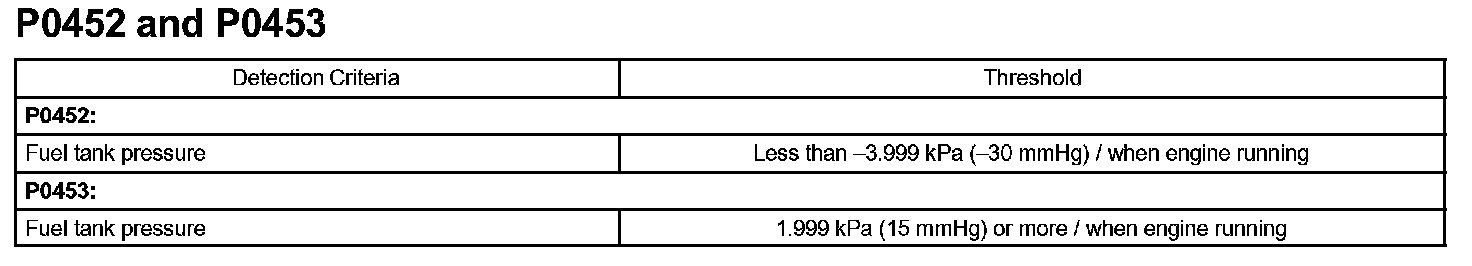 When pressure indicated by the vapor pressure sensor deviates below -3.999 kpa (-30 mmHg) or above 1.999 kpa (15 mmHg), the ECM interprets this as a malfunction in the vapor pressure sensor. The ECM will turn on the MIL and a DTC will be set.