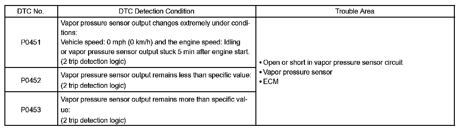 DTC "P0451, P0452 or P0453" is recorded by the ECM when the vapor pressure sensor malfunctions.