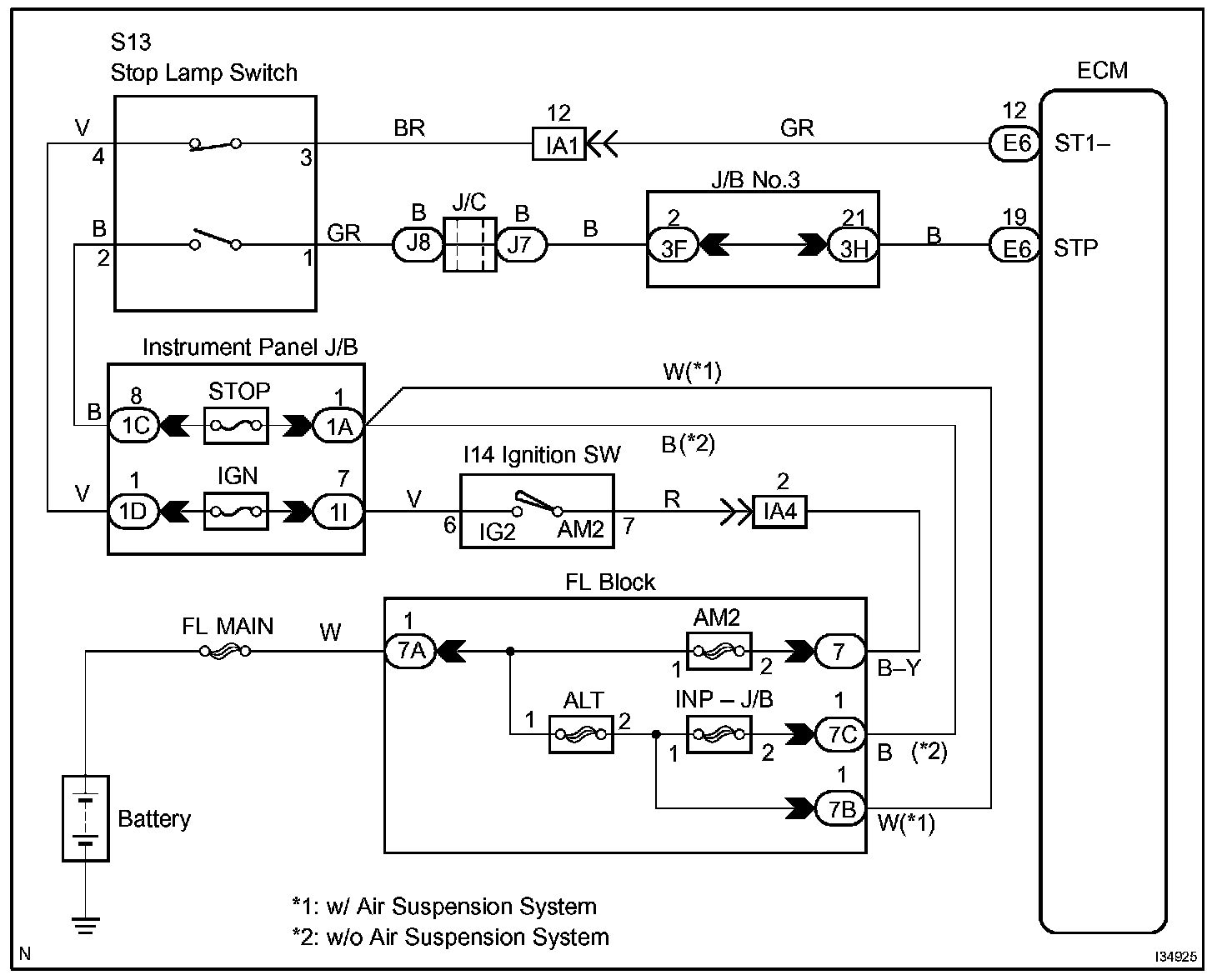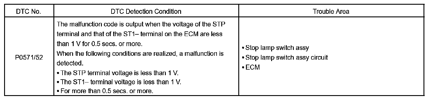 When the brake is ON, battery positive voltage is normally applied through the STOP fuse and the stop lamp switch assembly to terminal STP of the ECM, and the ECM turns the cruise control OFF.