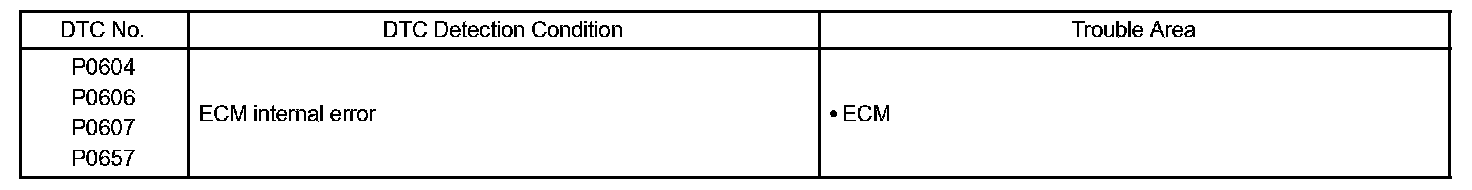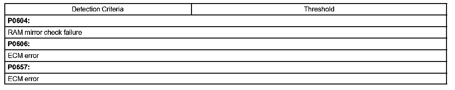The ECM memory status is diagnosed by internal "mirroring" of the main CPU and the sub CPU to detect random access memory (RAM) errors. The two CPUs also perform continuous mutual monitoring. If there is a difference between outputs from the two CPUs that deviates from standard level ranges, the ECM concludes that there is a fault and sets a DTC. Additionally, if the signals to the throttle actuator deviate from the standard range or if the ECM detects a malfunction in the throttle actuator supply voltage, the ECM will conclude that there is a fault and set a DTC. With any malfunction of the ECM, the MIL will be turned on and DTC (s) will be set.