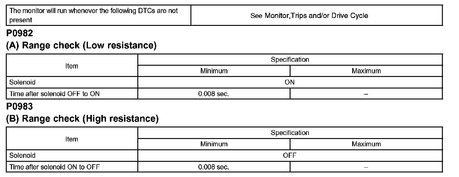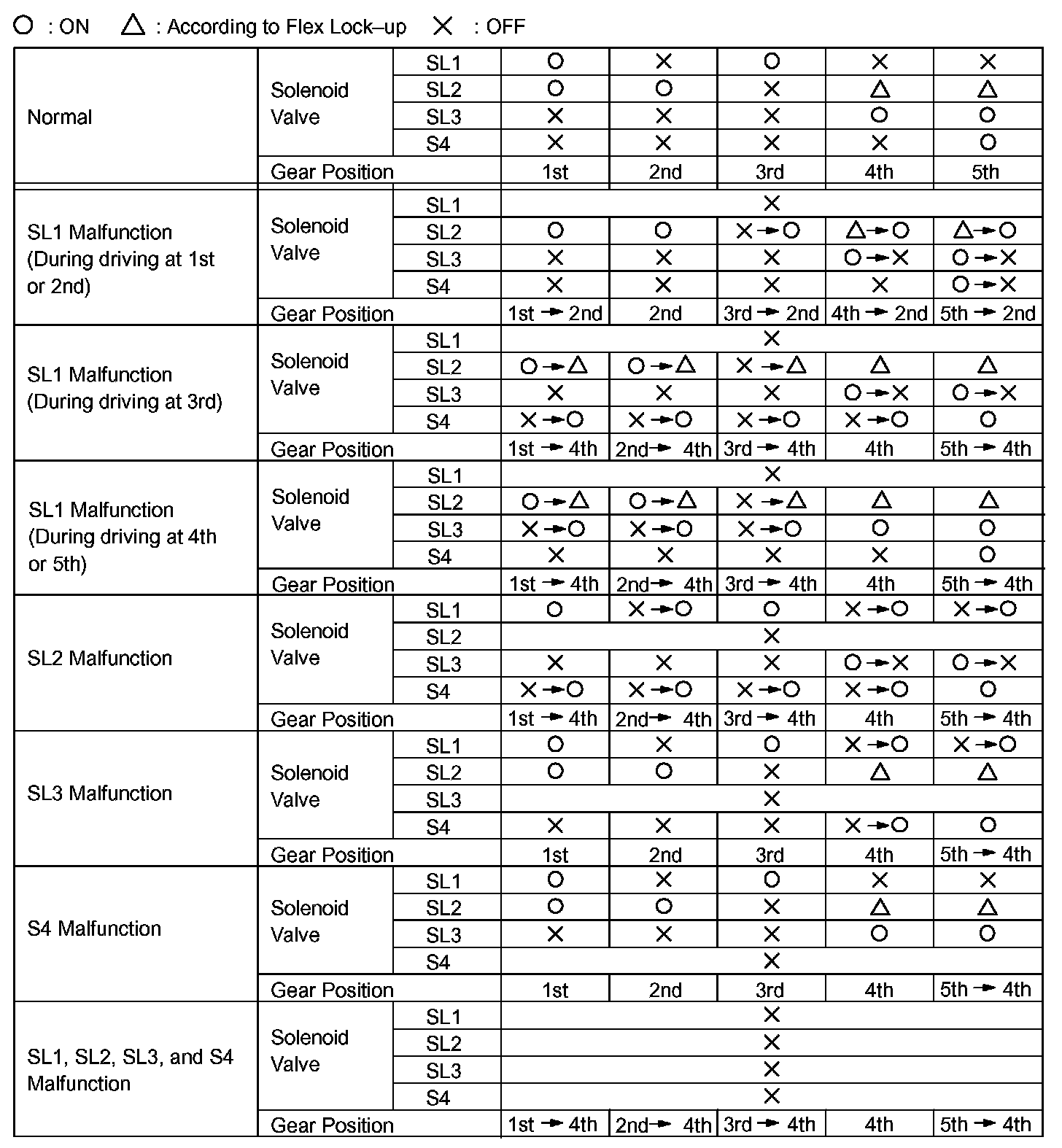 If either of the shift solenoid valve circuits develops an open or short, the ECM turns the other shift solenoid "ON" and "OFF" in order to shift into the gear positions shown in the table.