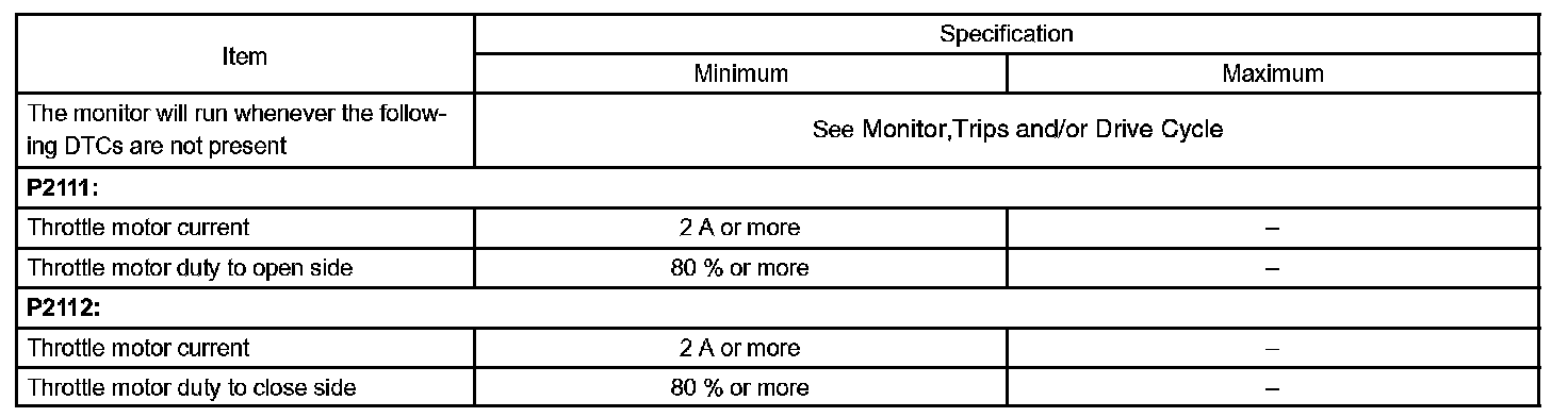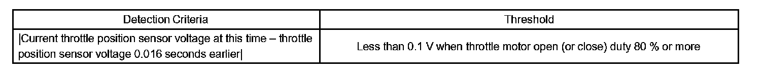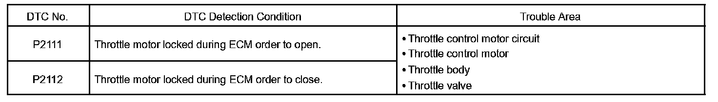 The ECM concludes that there is a malfunction of the electronic throttle control system ETCS when the throttle valve remains at a fixed angle despite high drive current from the ECM. The ECM will turn on the MIL and a DTC is set.