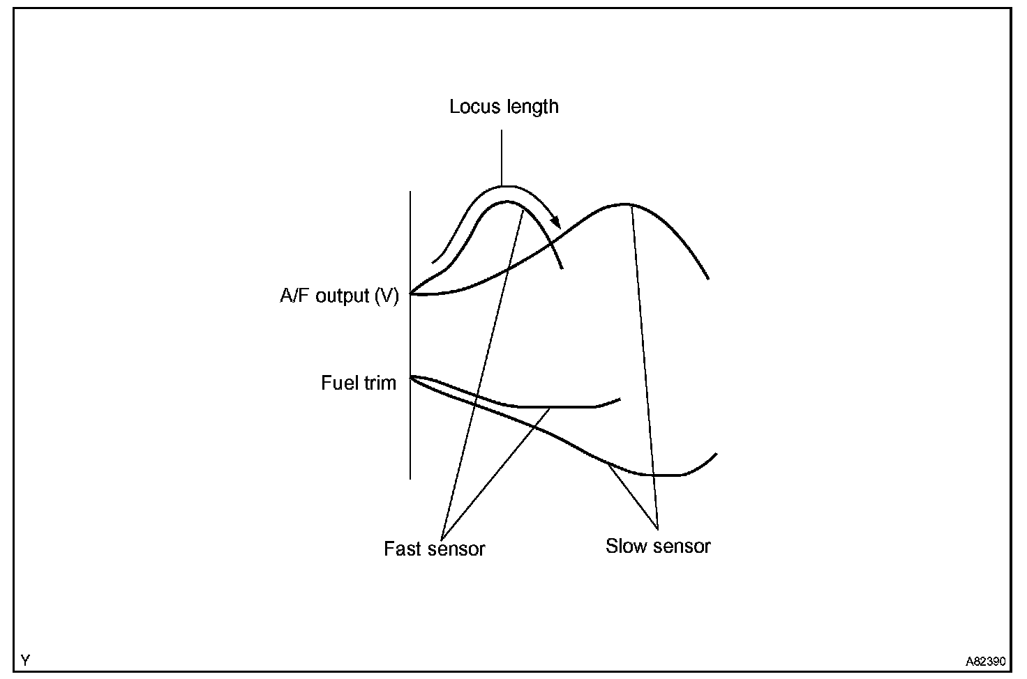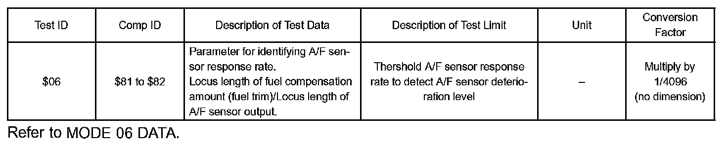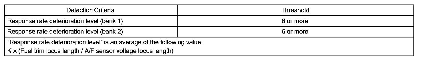 The air fuel ratio (A/F) sensor has a characteristic that it varies its voltage output in proportion to the air-fuel ratio. Based on the voltage output variation, the ECM judges the air-fuel ratio RICH or LEAN to adjust it close to the stoichiometric air-fuel ratio. The ECM observes variation in the A/F sensor voltage output and compares the compensation. Value of fuel injection volume (Fuel Trim) with it to detect deterioration in response of the A/F sensor itself. Normally, the voltage output of the sensor sharply fluctuates in accordance with rapid variation in the air-fuel ratio. This voltage output variation is represented as locus length. When the response rate has deteriorated, the locus length becomes shorter as the voltage output fluctuation is comparatively slow and small. The ECM concludes that there is a malfunction in the A/F sensor when the locus length is short and the response rate has deteriorated.