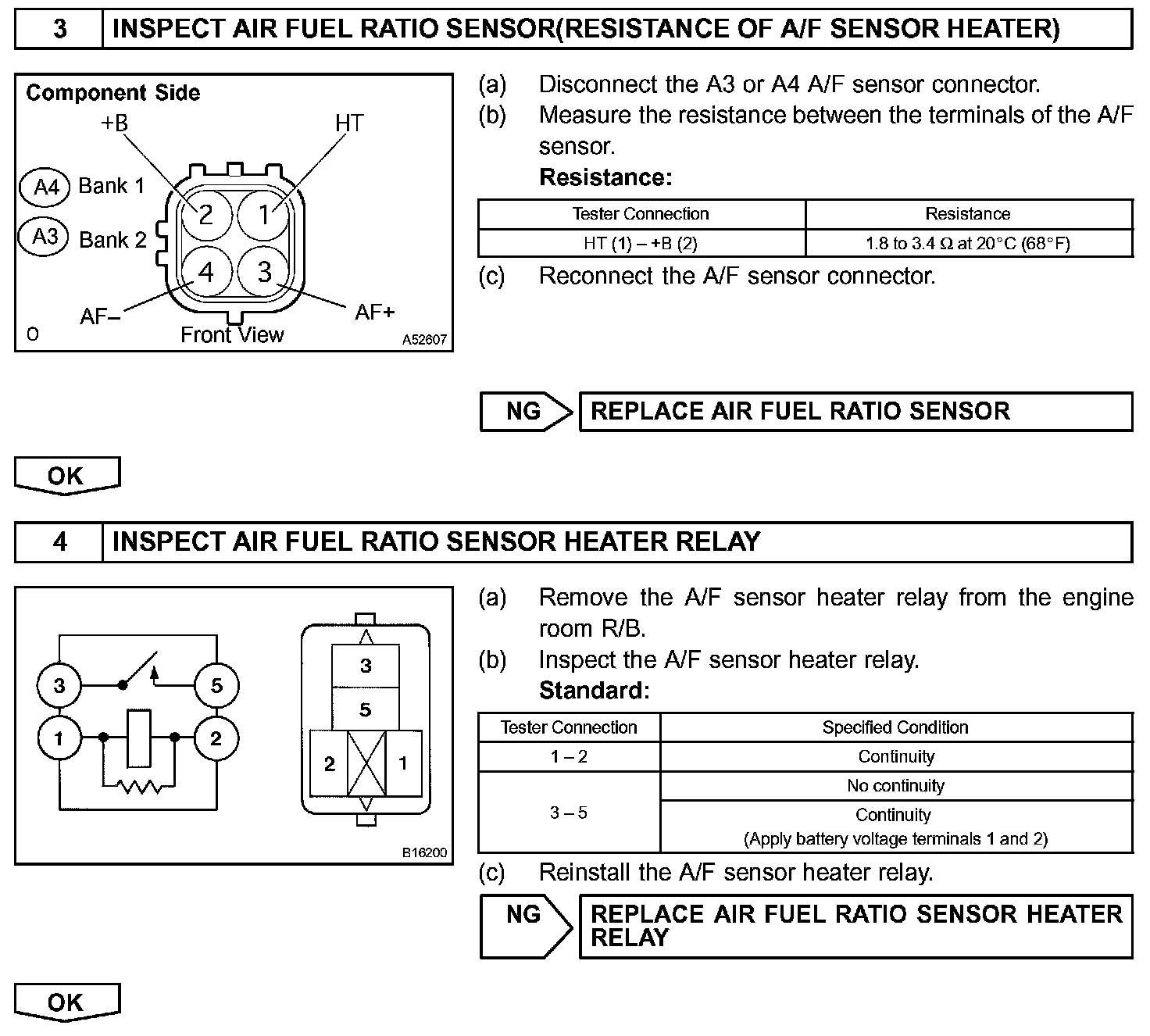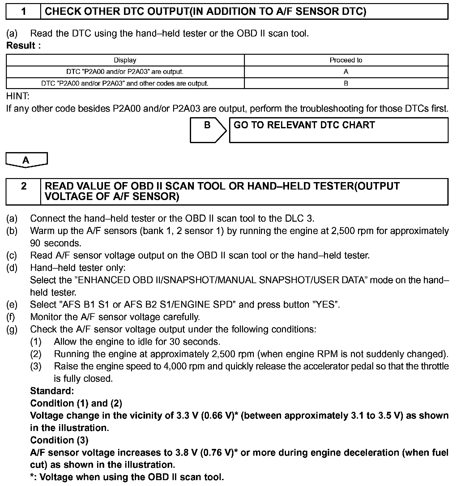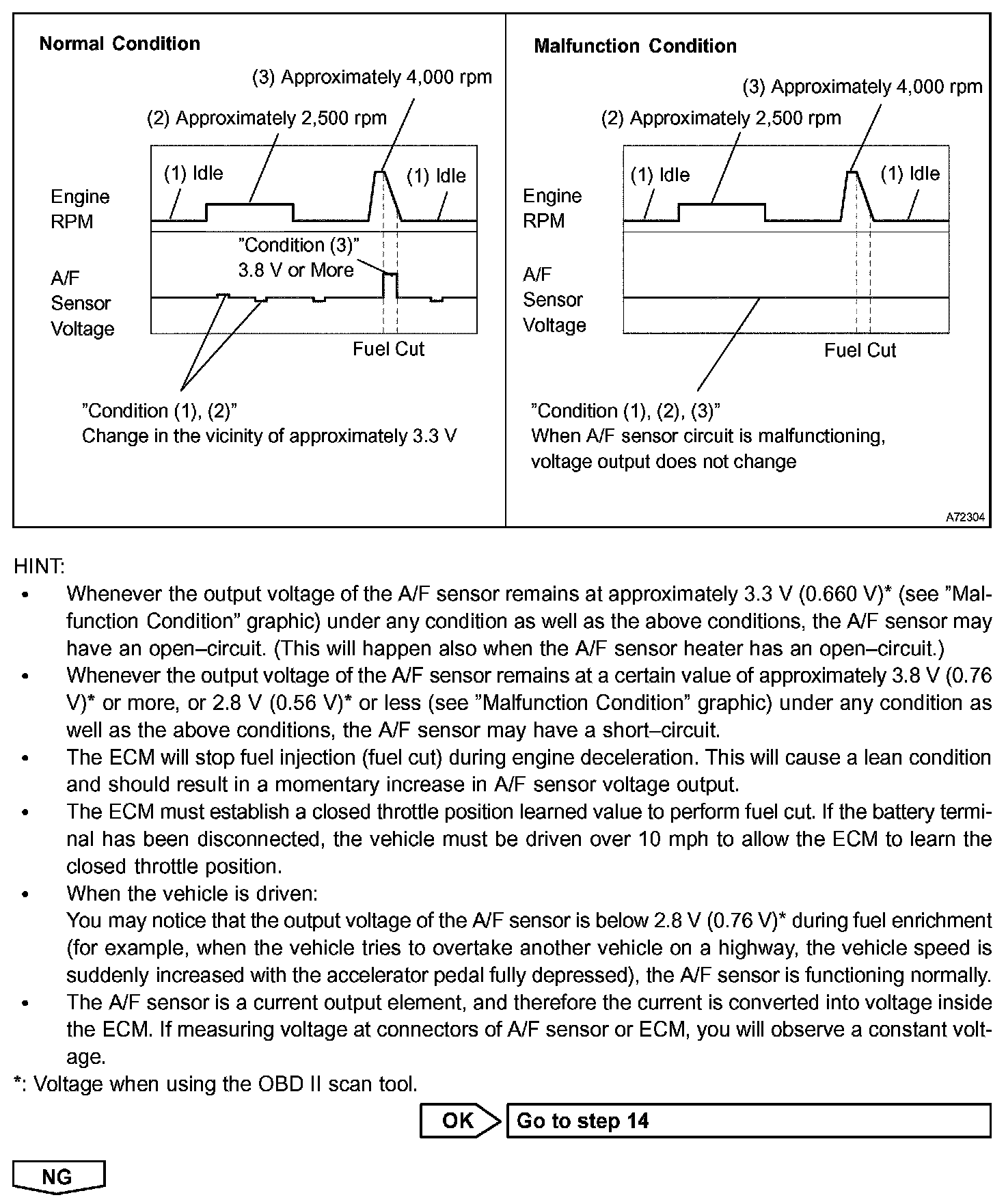 The following A/F CONTROL procedure enables the technician to check and graph the voltage outputs of both the A/F sensor and the heated oxygen sensor.