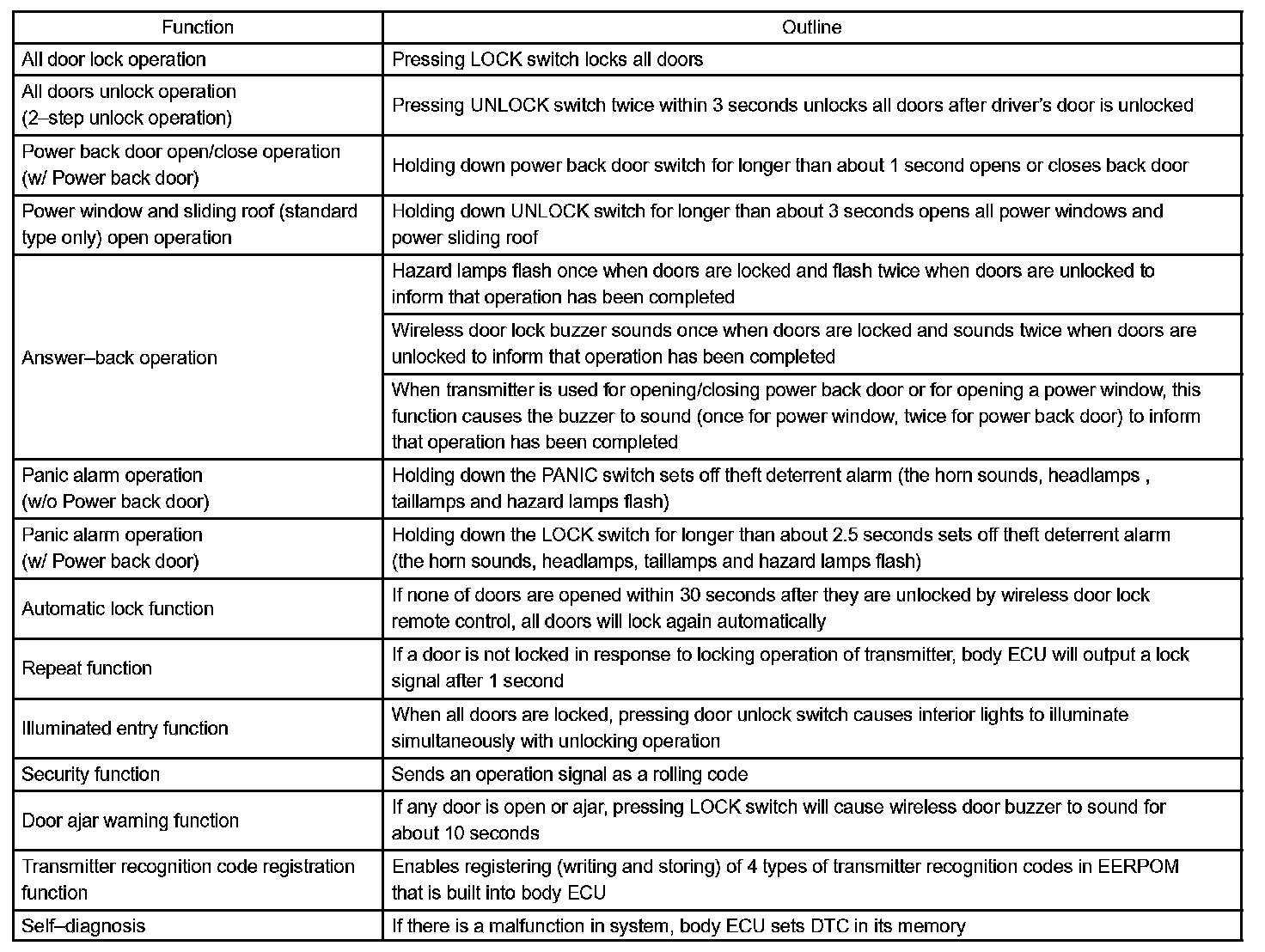 A key-integrated type transmitter is used and it contains the following 3 switches: the door lock (panic) switch, door unlock switch and power back door switch.
