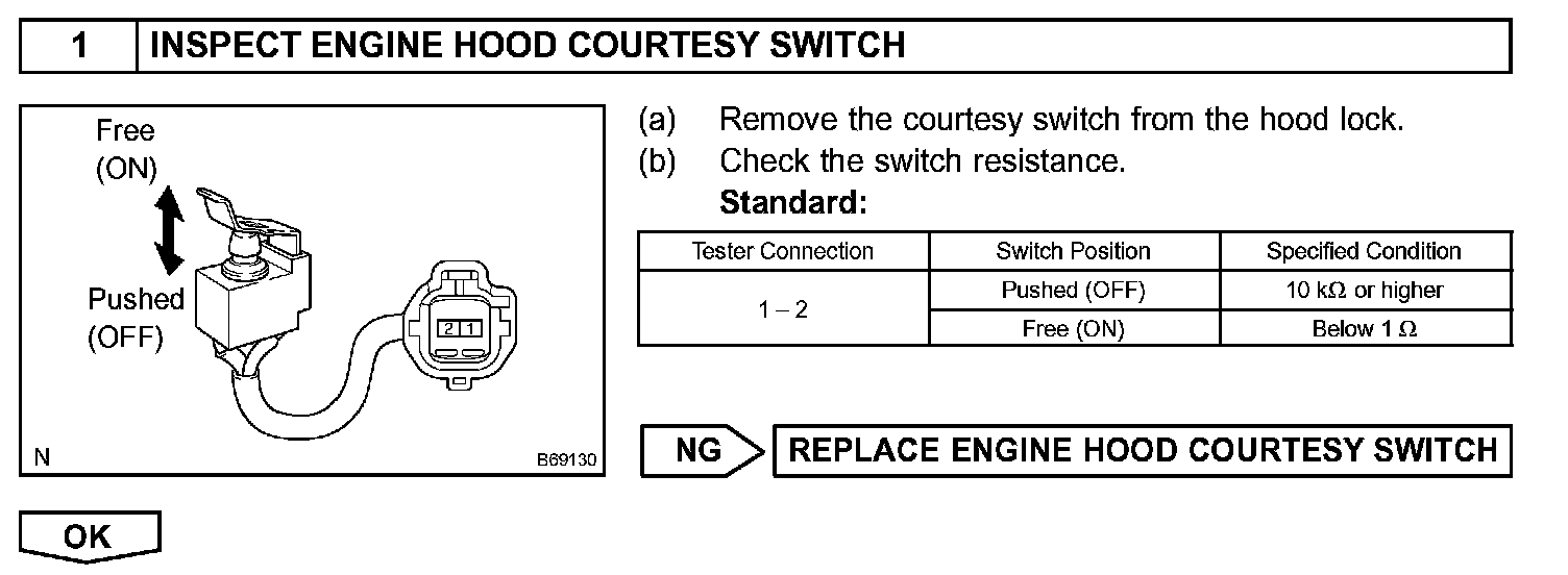 The engine hood courtesy switch is installed together with the hood lock. This switch turns on when the engine hood is opened and turns off when the engine hood is closed.