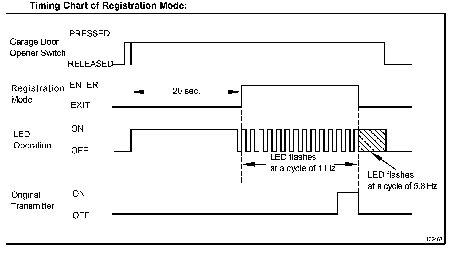 HINT: When the garage door opener is in registration mode, the LED changes from ON to flashing at a cycle of 1 Hz.(In the case of the "rolling code" type, the LED will flash at a cycle of 8.8 Hz for 1.6 seconds at first and then change the flash cycle to 1 Hz after the garage door opener has entered registration mode.)