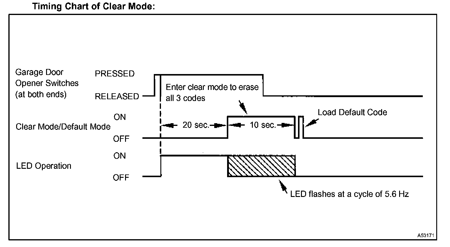 - If the switches are held for 10 seconds or more after the transmitter codes have been erased, default codes will be set to all the 3 switches of the garage door opener. With this default code, you can check operation of the garage door opener using a tester.
