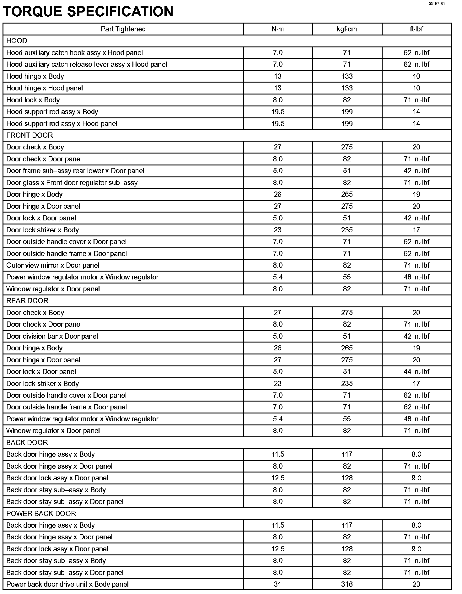 Engine Hood / Door - Torque Specification:
