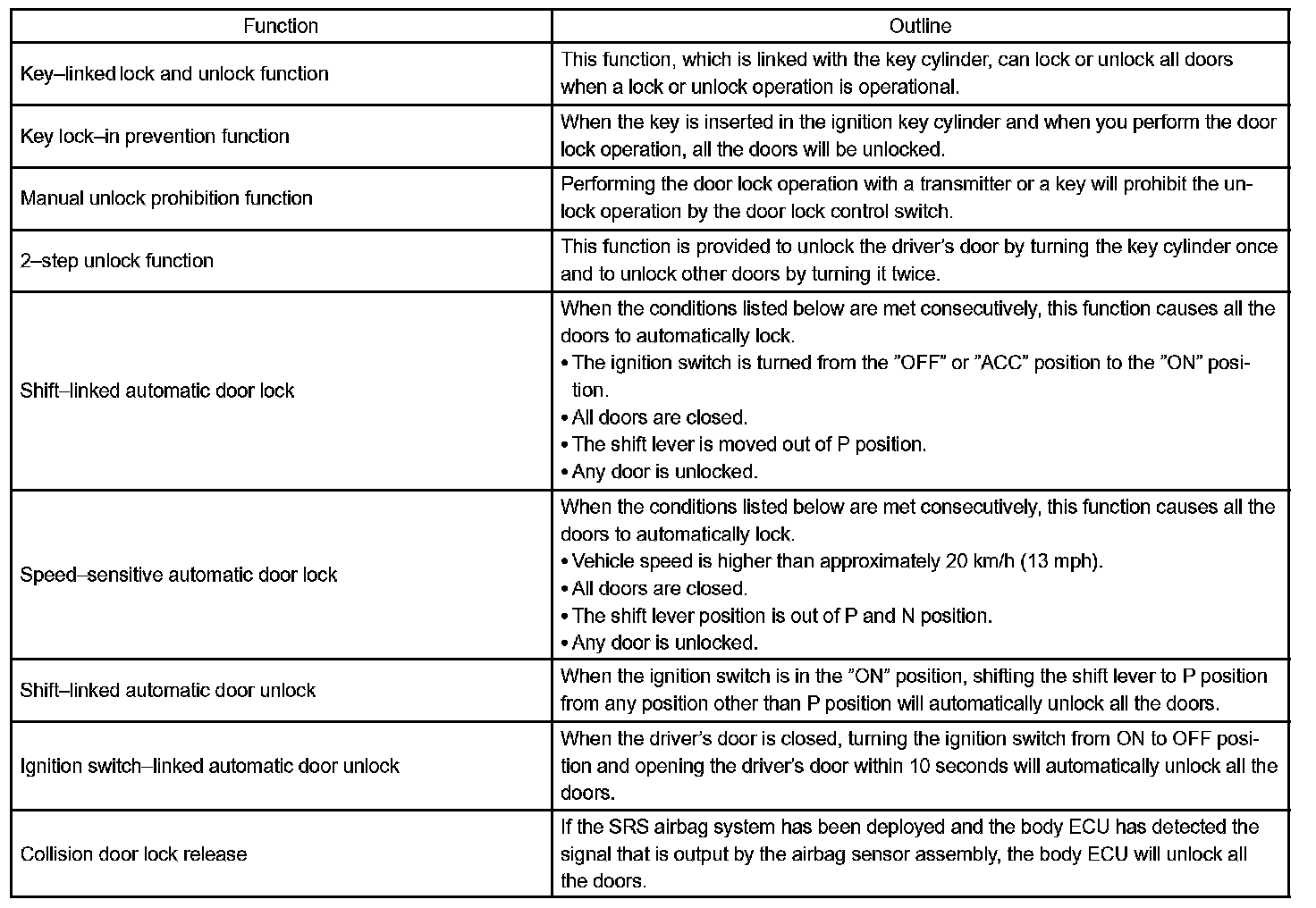 Operating the driver's door lock using a key sends request signals to lock/unlock the doors to the body ECU via the master switch. "2-step unlock function" is optional for unlocking procedures of the key-linked lock for the driver side door. Please refer to the chart shown in step b. for details of this function.