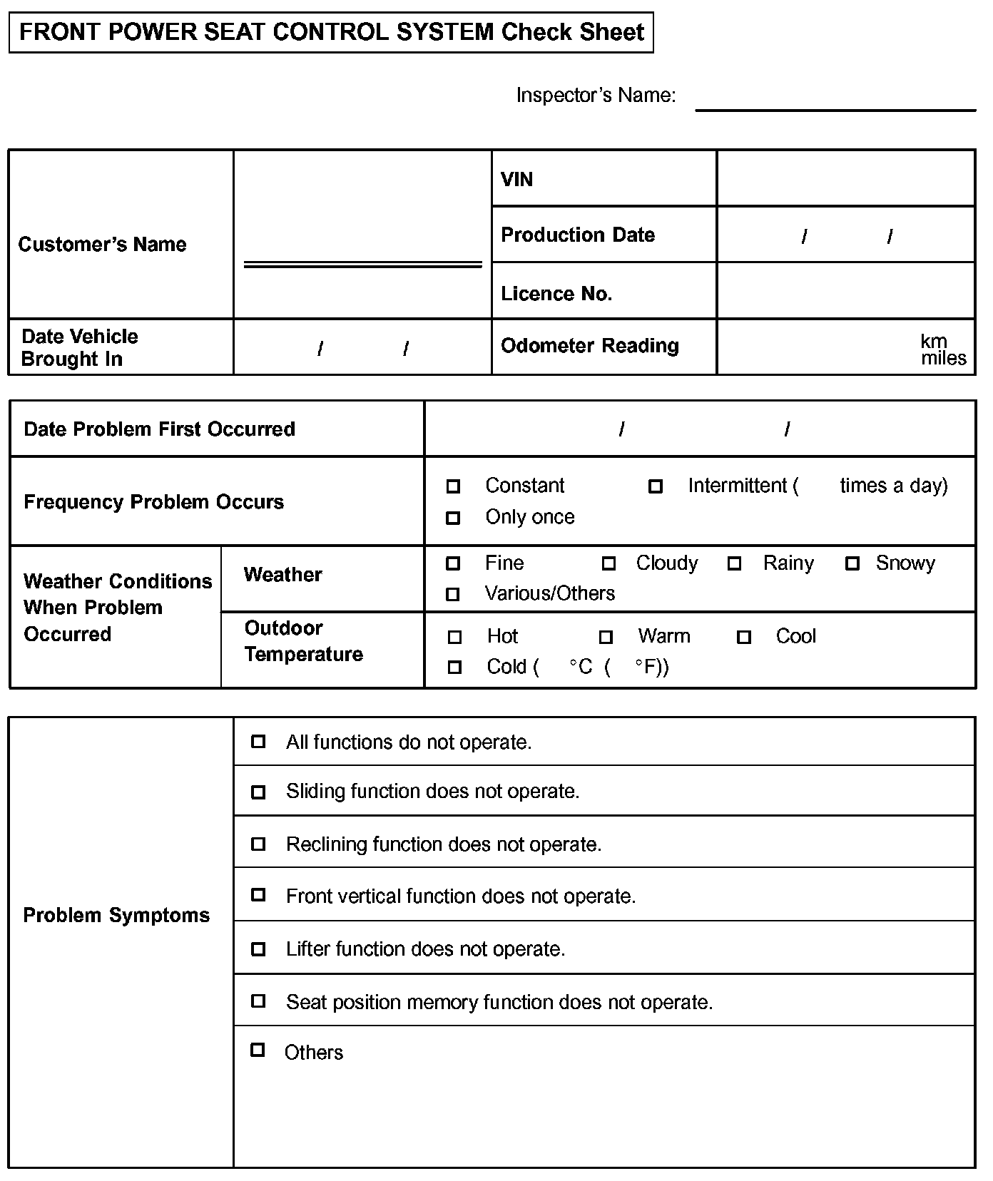 Front Power Seat Control System Check Sheet: