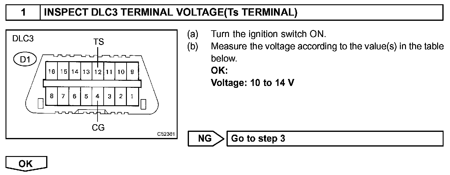 Transition to the sensor check mode can be performed by connecting terminals Ts and CG of the DLC3 and turning the ignition switch from off to the ON position.