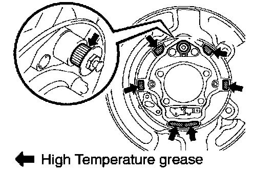 a. Apply high temperature grease to those are as of the backing plate which make contact with the shoe.