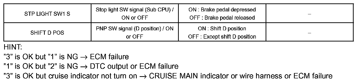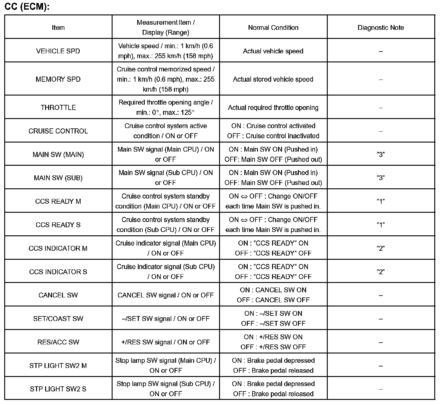 While the hand-held tester is connected to the DLC3 and with the ignition switch turned to the ON position, the CRUISE CONTROL data list can be displayed. Follow the prompts on the tester screen to access the data list.