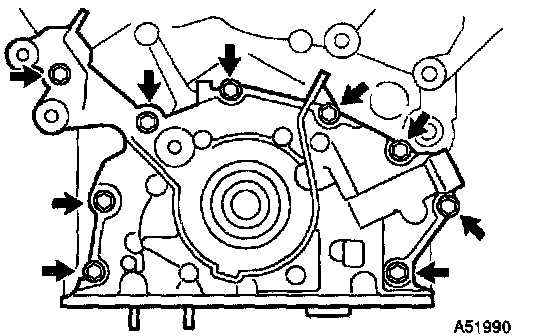 e. Install the oil pump with the 9 bolts. Tighten the bolts uniformly in several steps.