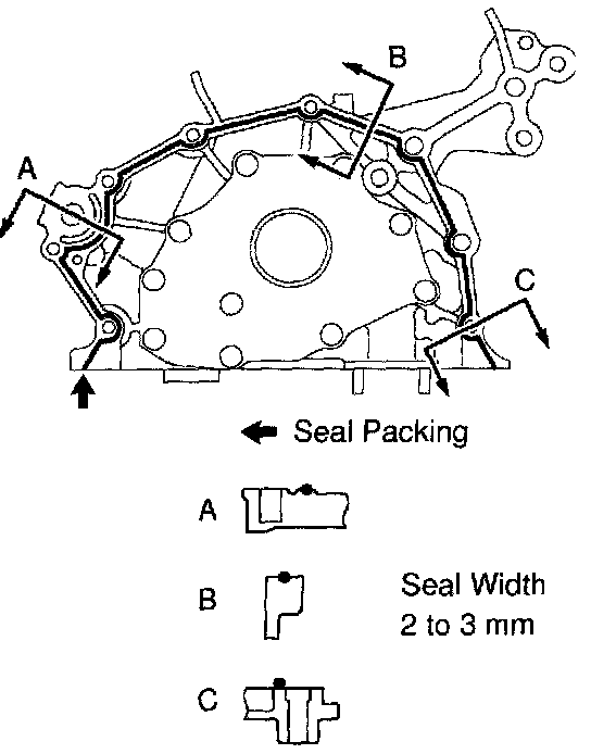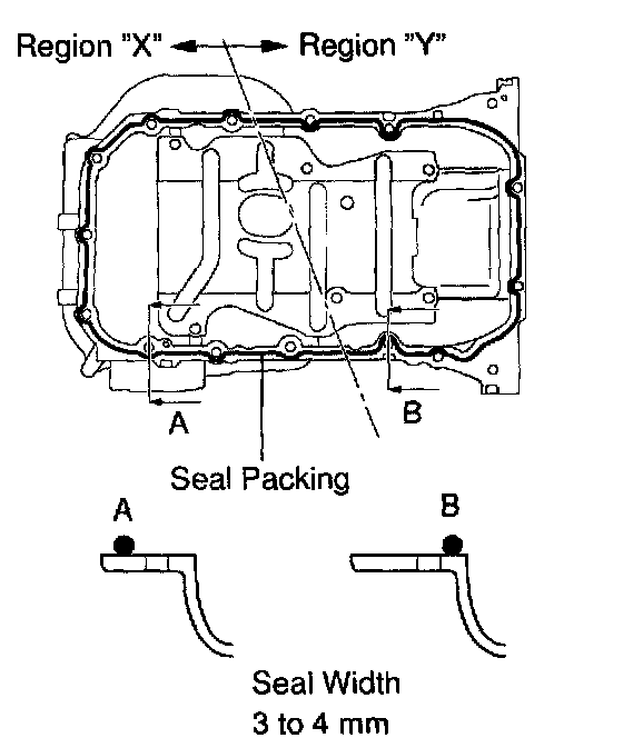 b. Apply a continuous bead of seal packing (Diameter 3 to 4 mm (0.12 to 0.16 inch)) as shown in the illustration.