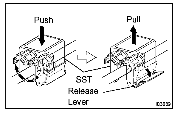 c. Pull SST(s) slightly and push the release lever, and then remove the piping clamp with SST(s).