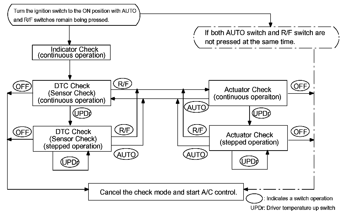 LIST OF OPERATION METHODSBy operating each of the A/C control switches as shown in the diagram, it is possible to enter the diagnostic check mode.