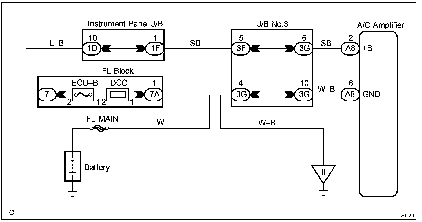 This is the back-up power source circuit for the A/C amplifier. Power is supplied even when turning the ignition switch off and is used for diagnostic trouble code memory etc.