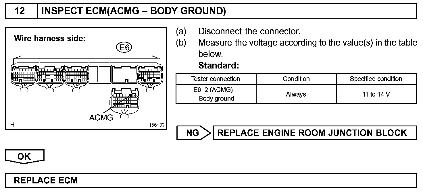 The air conditioning amplifier outputs the magnetic clutch ON signal from the MPX terminal to the ECM which receives this signal. It then sends the signal from the ACMG terminal and switches the magnetic clutch relay on, thus turning on the magnetic clutch.