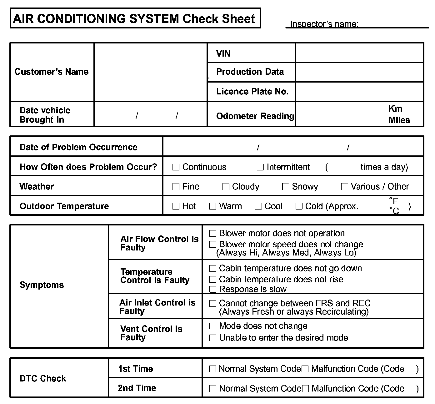 Air Conditioning System Check Sheet: