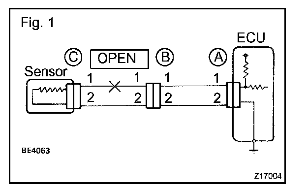 a. For the open circuit in the wire harness in Fig. 1, perform a continuity check in step (b) or a voltage check in step (c) to locate the section.