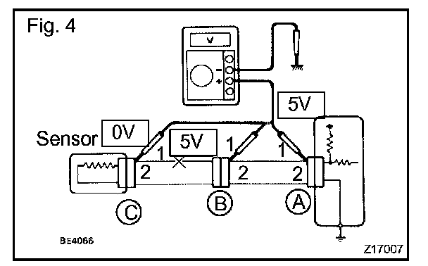 As shown in Fig. 4, with each connector still connected, measure the voltage between the body ground and terminal 1 of connector A at the ECU 5 V output terminal, terminal 1 of connector B, and terminal 1 of connector C in that order.