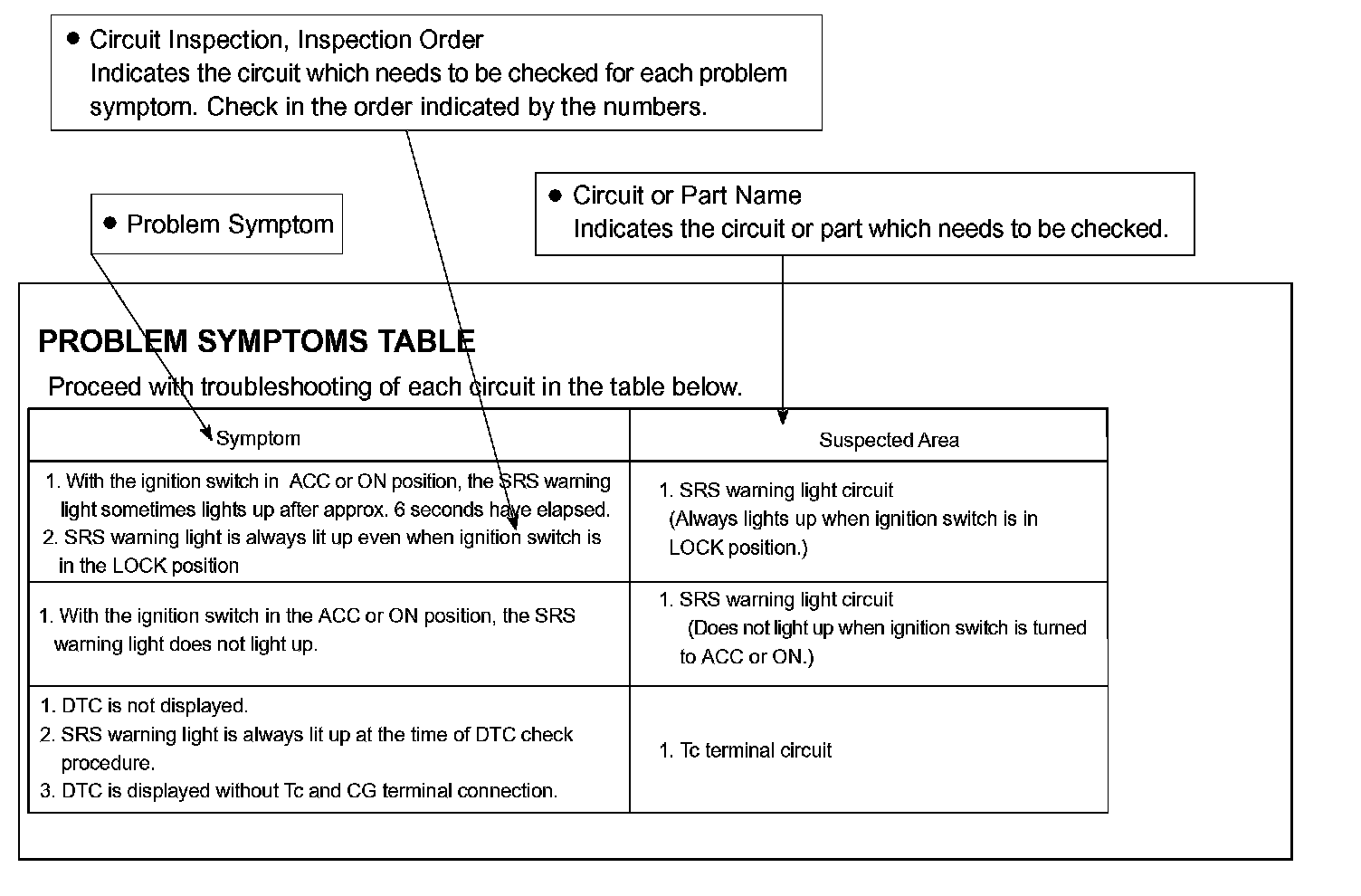 The suspected circuits or parts for each problem symptom are shown in the table. Use this table to troubleshoot the problem when a Normal code is displayed in the diagnostic trouble code chart but the problem is still occurring. Numbers in the table indicate the inspection order in which the circuits or parts should be checked.