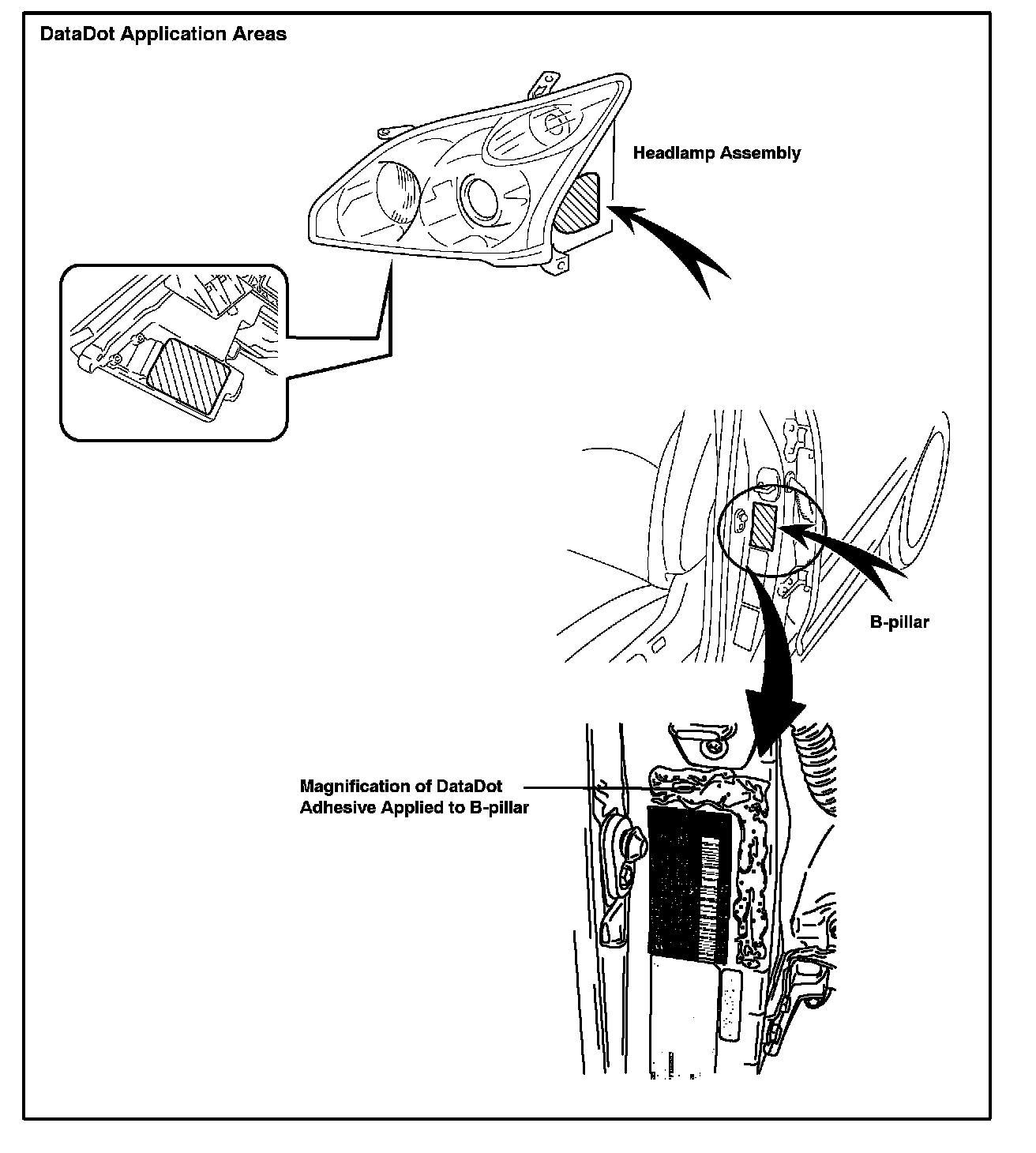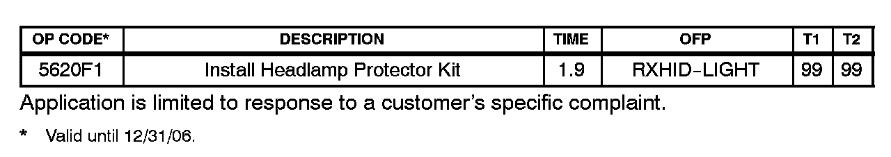 ^ September 26, 2005: The "Production Change Information" section has been removed because the "Applicable Vehicles" section has been updated to include all 2004 - 2005 model year RX 330 vehicles equipped with High Intensity Discharge (HID) headlamps. The OFP has been updated in the "Installation Reimbursement Procedure" section. The "Disassemble Headlamp Assembly" and "Applying DataDots" sections have been updated.