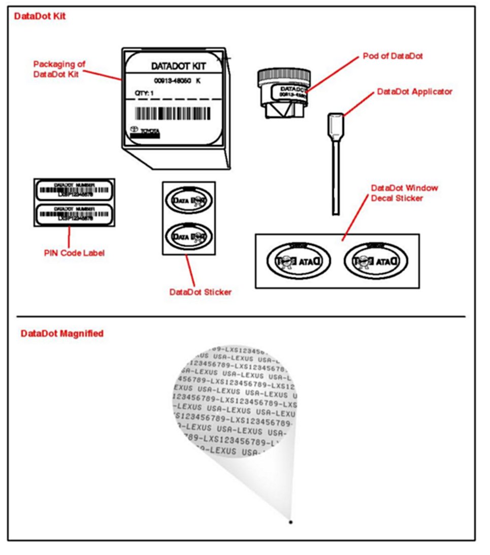 To address the High Intensity Discharge (HID) theft issue that has affected some Lexus customers and dealers in the Eastern Area, Lexus has developed a kit that will register the HID headlight components to the customer's vehicle by using a DataDot(R) application system. In addition, the kit will include special mounting brackets to help secure the light assemblies into the vehicle. This bulletin provides instructions on how to install this kit and register the components.
