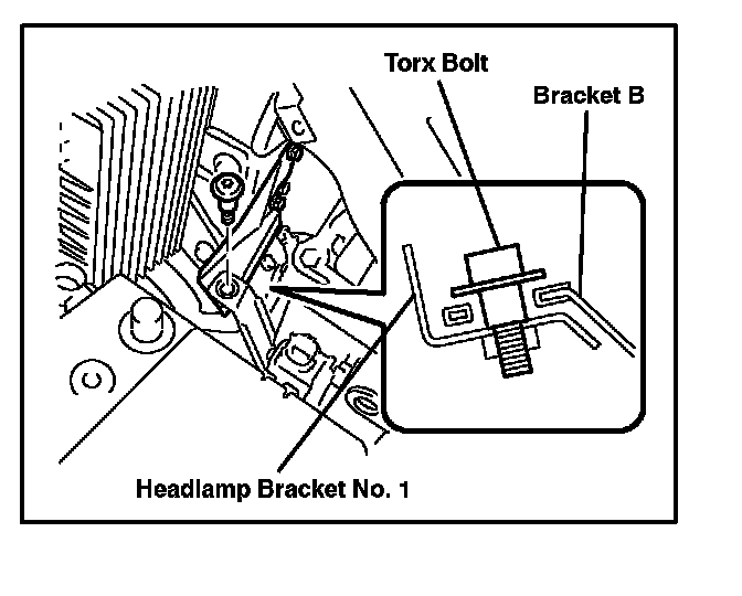B. Adjust the location of headlamp bracket No. 1. Keep clearance between bracket B and the headlamp bracket No. 1 and Torx bolt assembly as shown in the illustration.