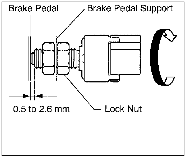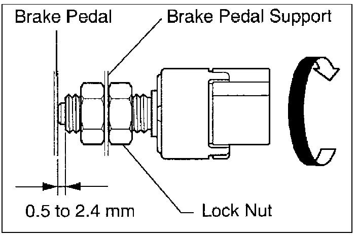 1. Rotate the light switch so that the clearance between the thread portion tip and the area where the pedal makes contact is between 0.5 and 2.4 mm (0.020 in. and 0.095 in.).