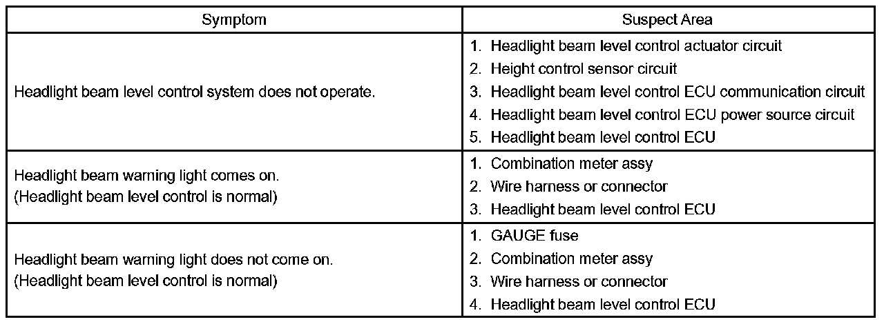 Problem Symptoms Table - Headlight Beam Level Control System: