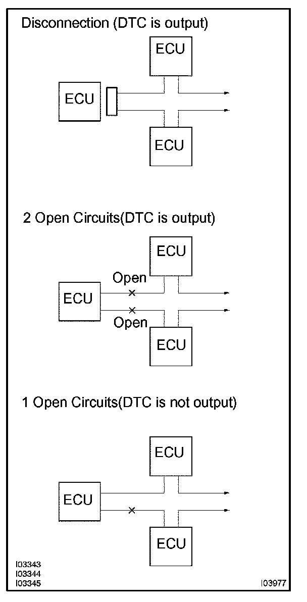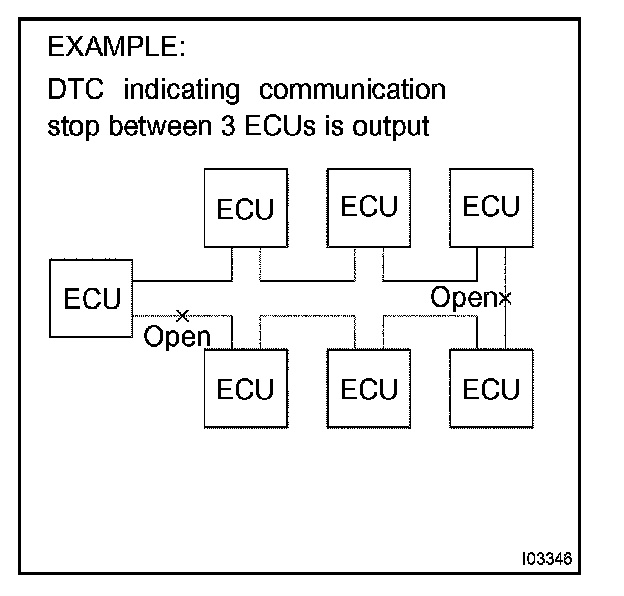 c. If 2 communication buses are open at the positions as shown in the illustration, DTC indicating ECU communication stop between those 2 buses is output.