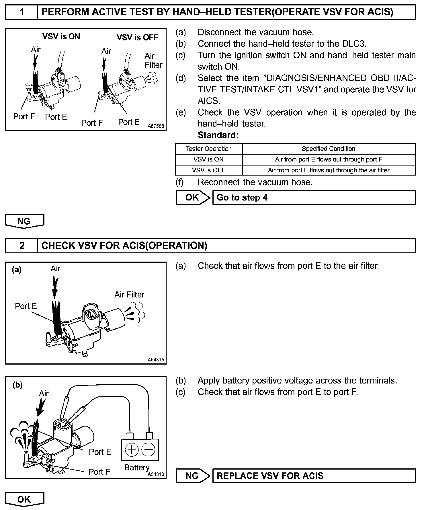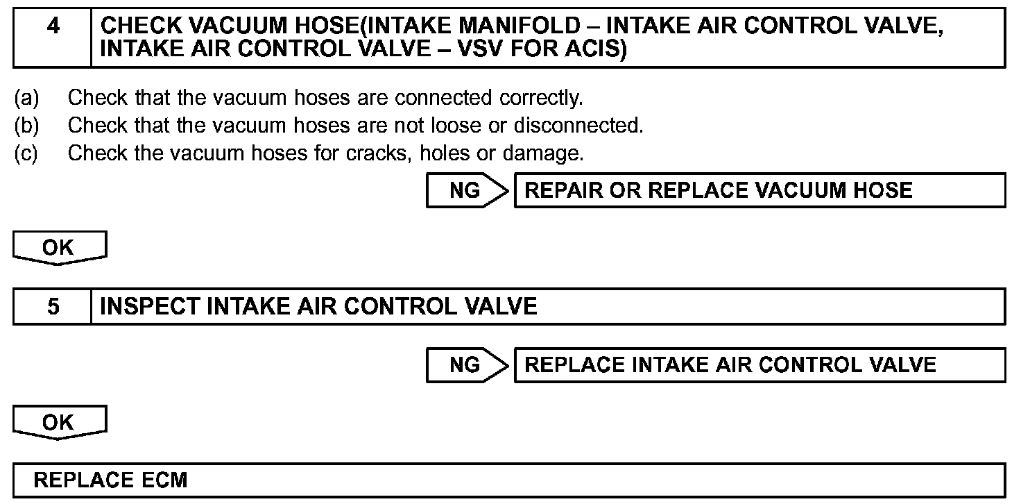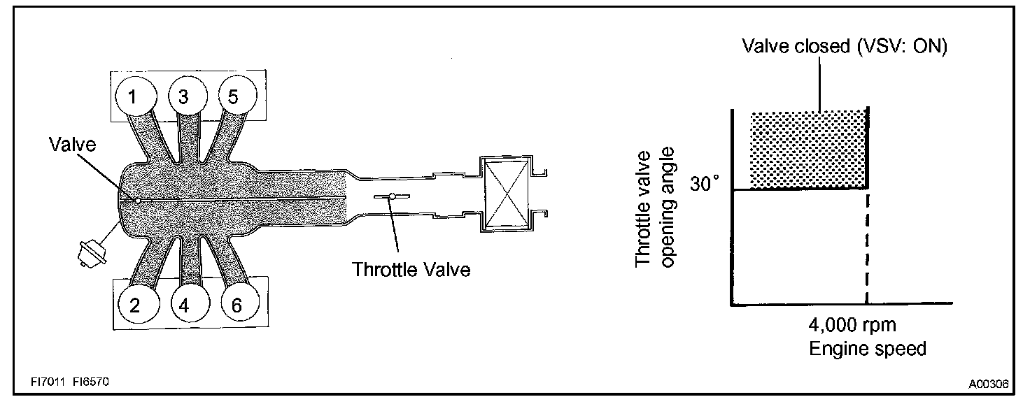 When the engine speed is 4,000 rpm or less and the throttle valve opening angle is 30 ° or more, the ECM turns the VSV ON or OFF to operate the intake Air Control Valve.