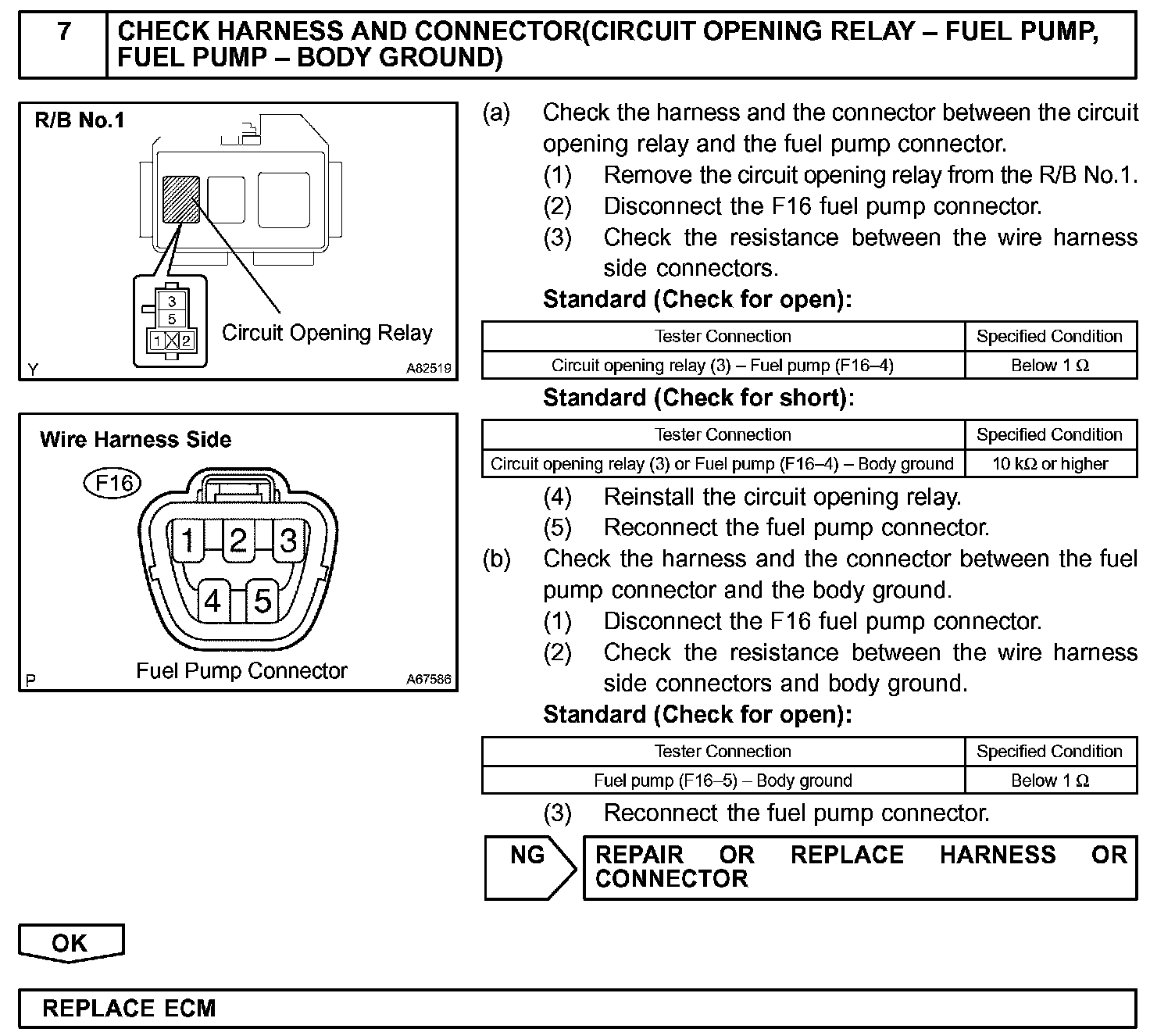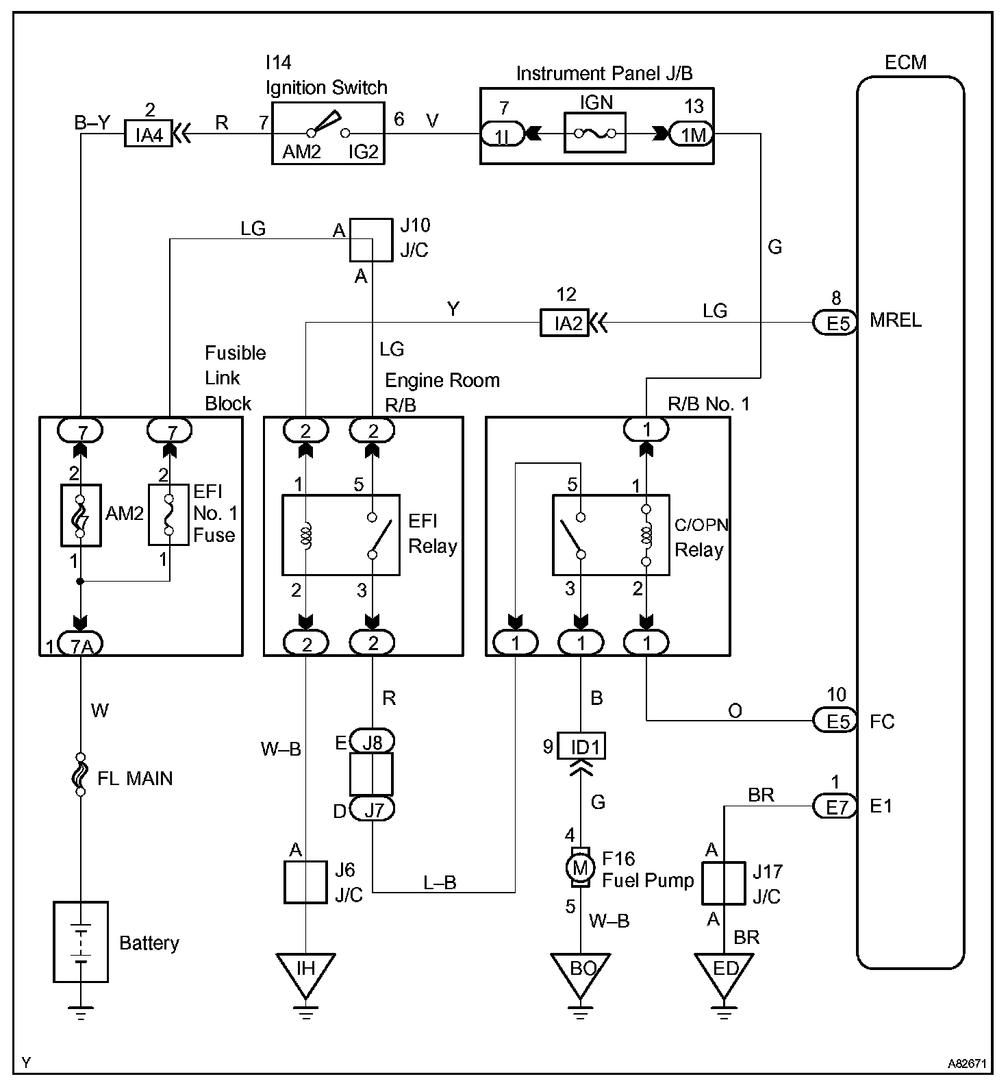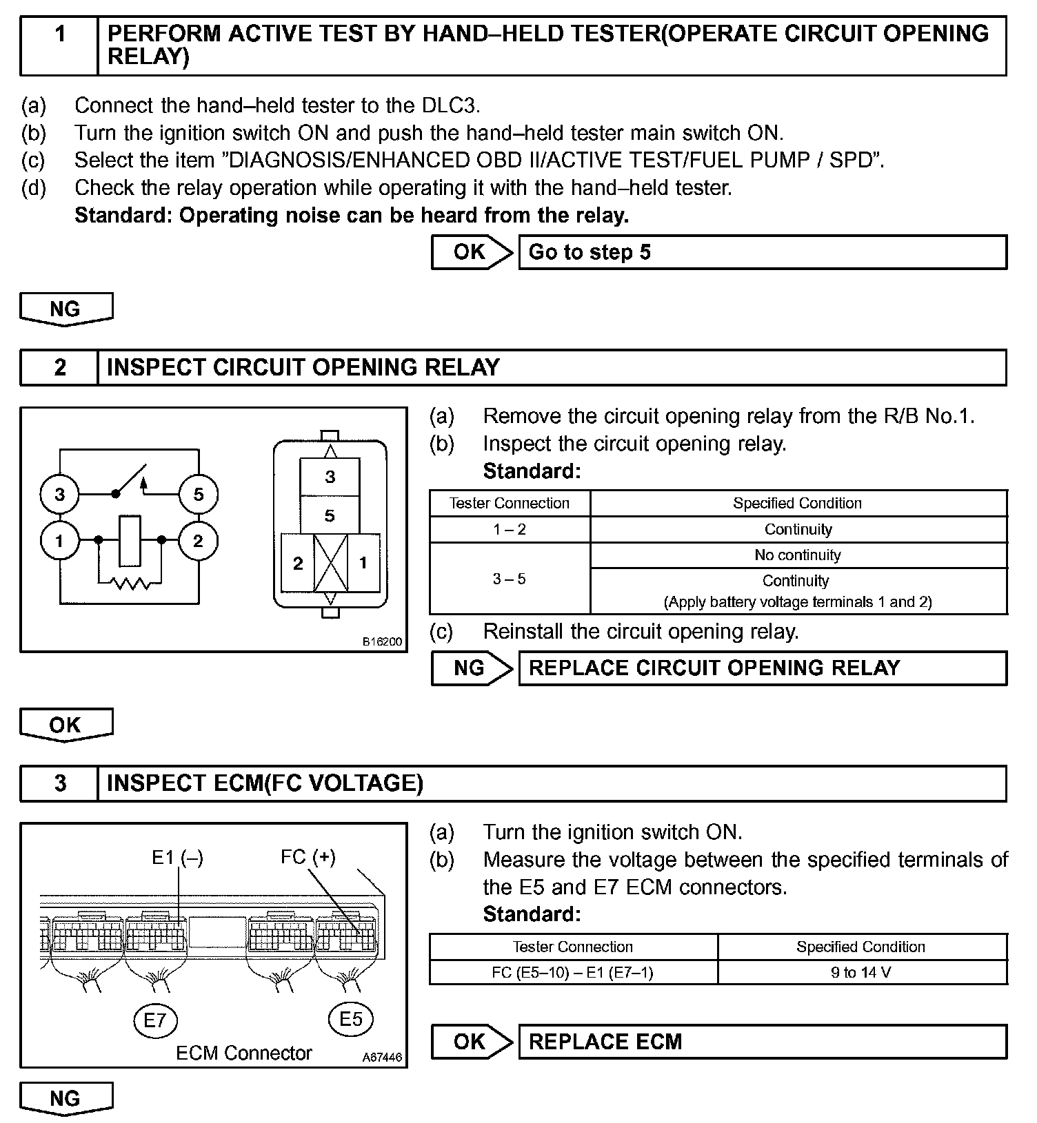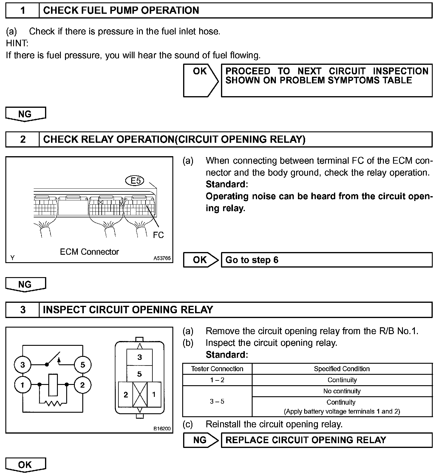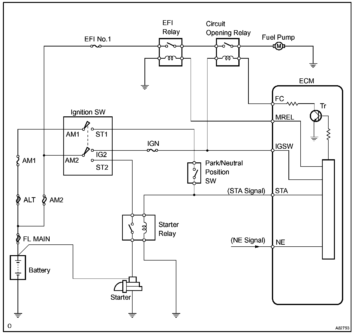 When the STA signal and NE signal are input to the ECM, Tr is turned ON, current flows to coil of the circuit opening relay (Marked: C/OPN), the relay switches on, power is supplied to the fuel pump and the fuel pump operates.