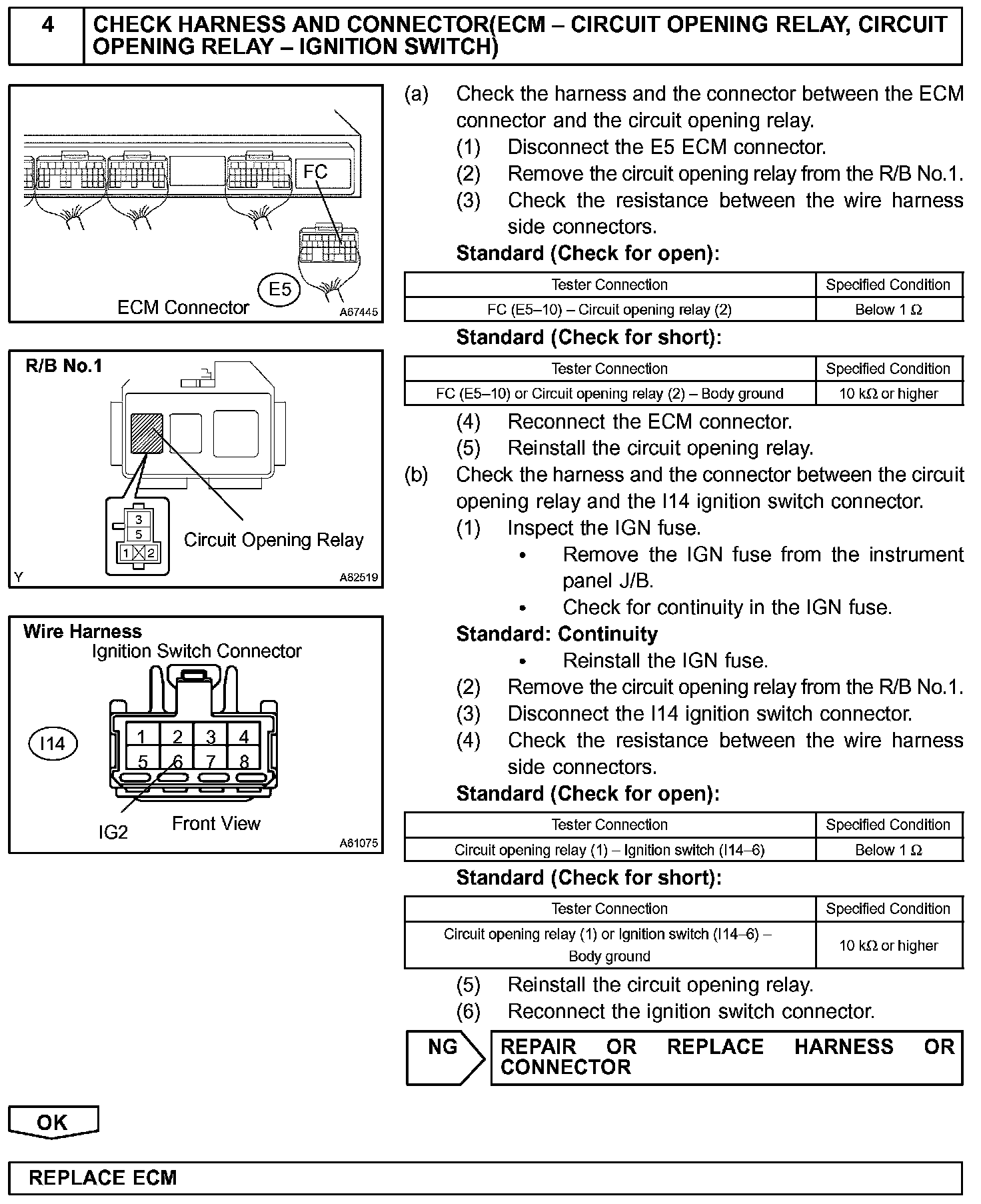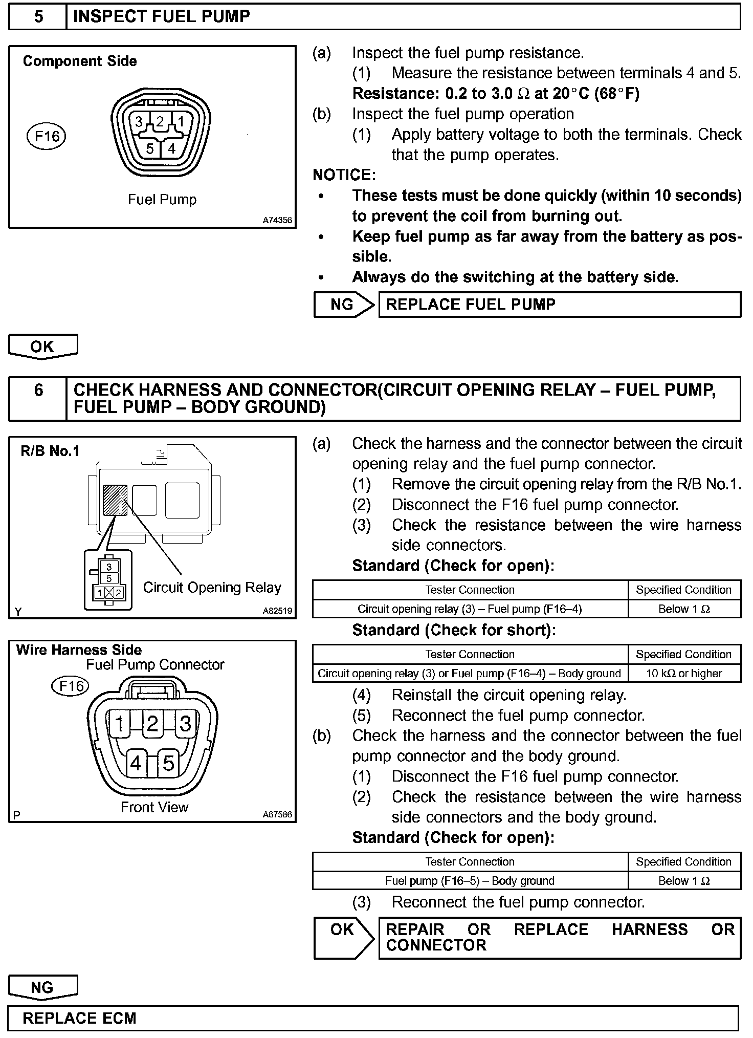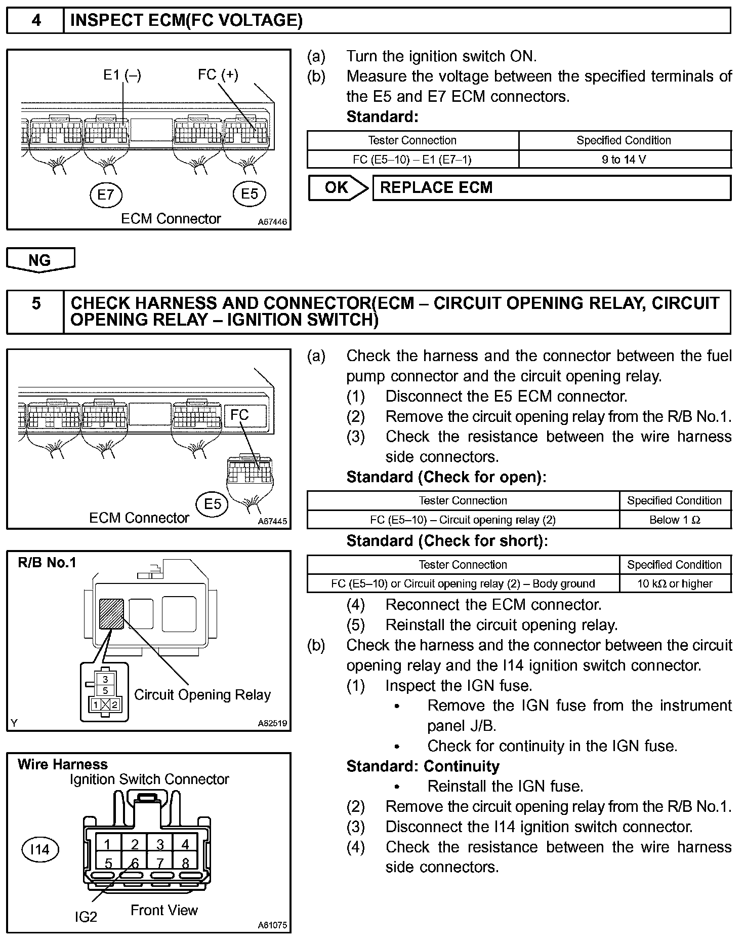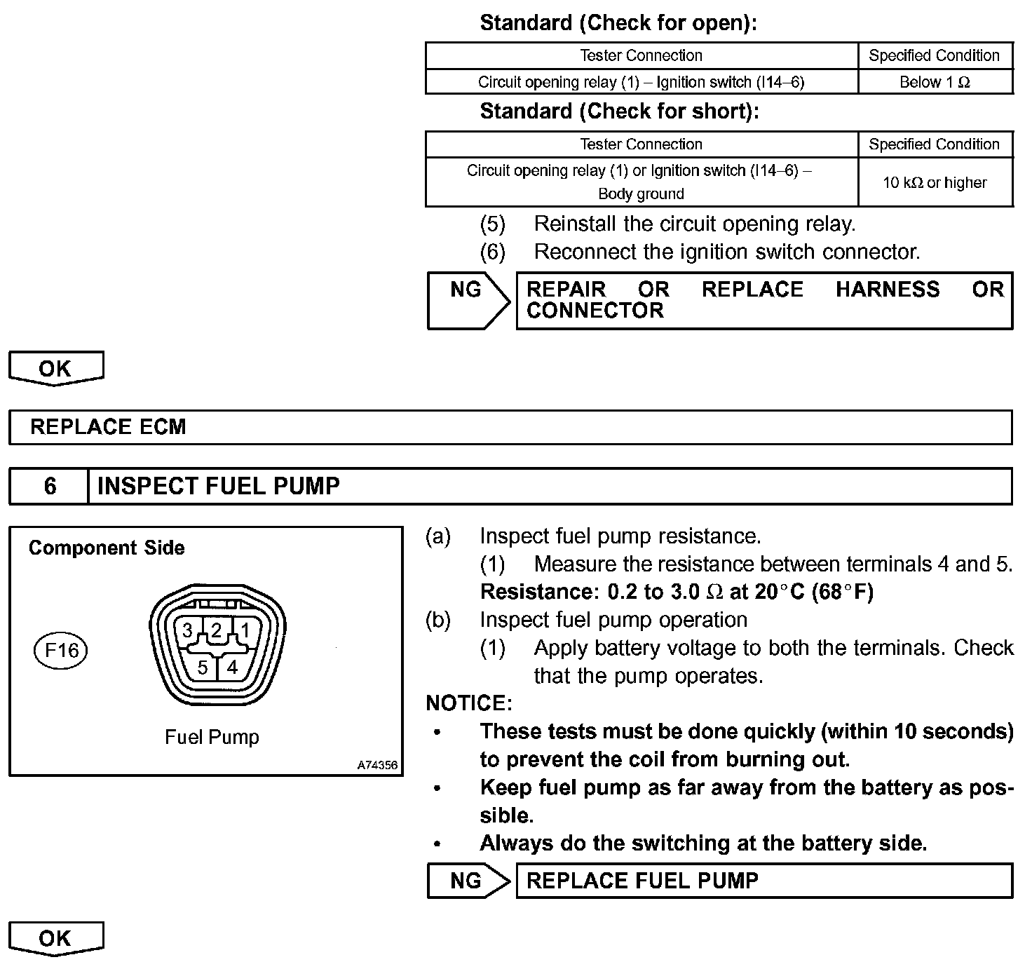 While the NE signal is generated (engine running), the ECM keeps Tr ON (circuit opening relay ON) and the fuel pump also keeps operating.