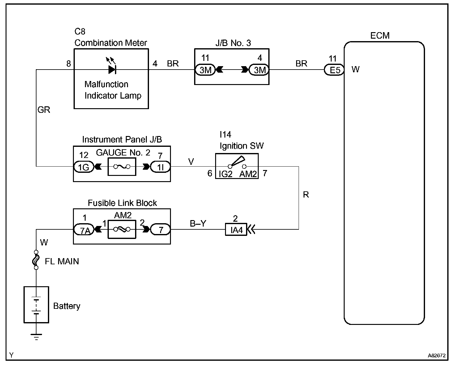 The instrument panel GAUGE fuse provides circuit power and the ECM provides the circuit ground that illuminates the MIL.
