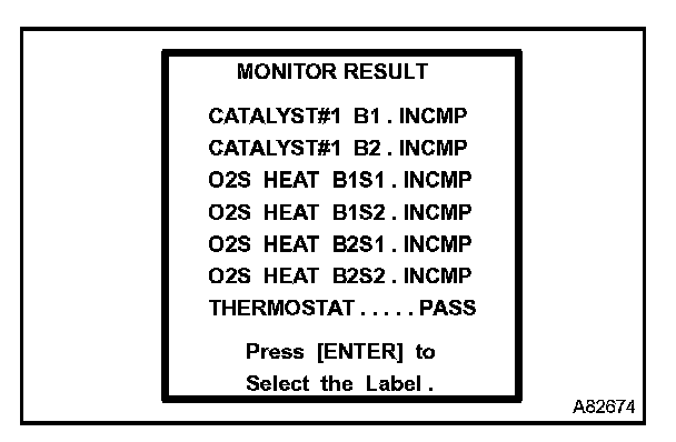 b. Enter "MONITOR RESULT" from "DIAGNOSIS/ENHANCED OBD II/MONITOR INFO/MONITOR RESULT" on the hand-held tester. You will see "Test ID" and "INCMP", "Pass" or "Fail" on the MONITOR RESULT screen.