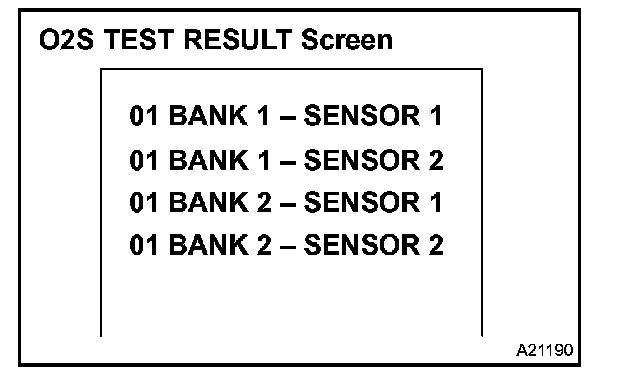 b. On the tester screen, select the following menus: DIAGNOSIS/CARB OBD II/O2S TEST RESULT. A list of the O2S equipped on the vehicle will be displayed.