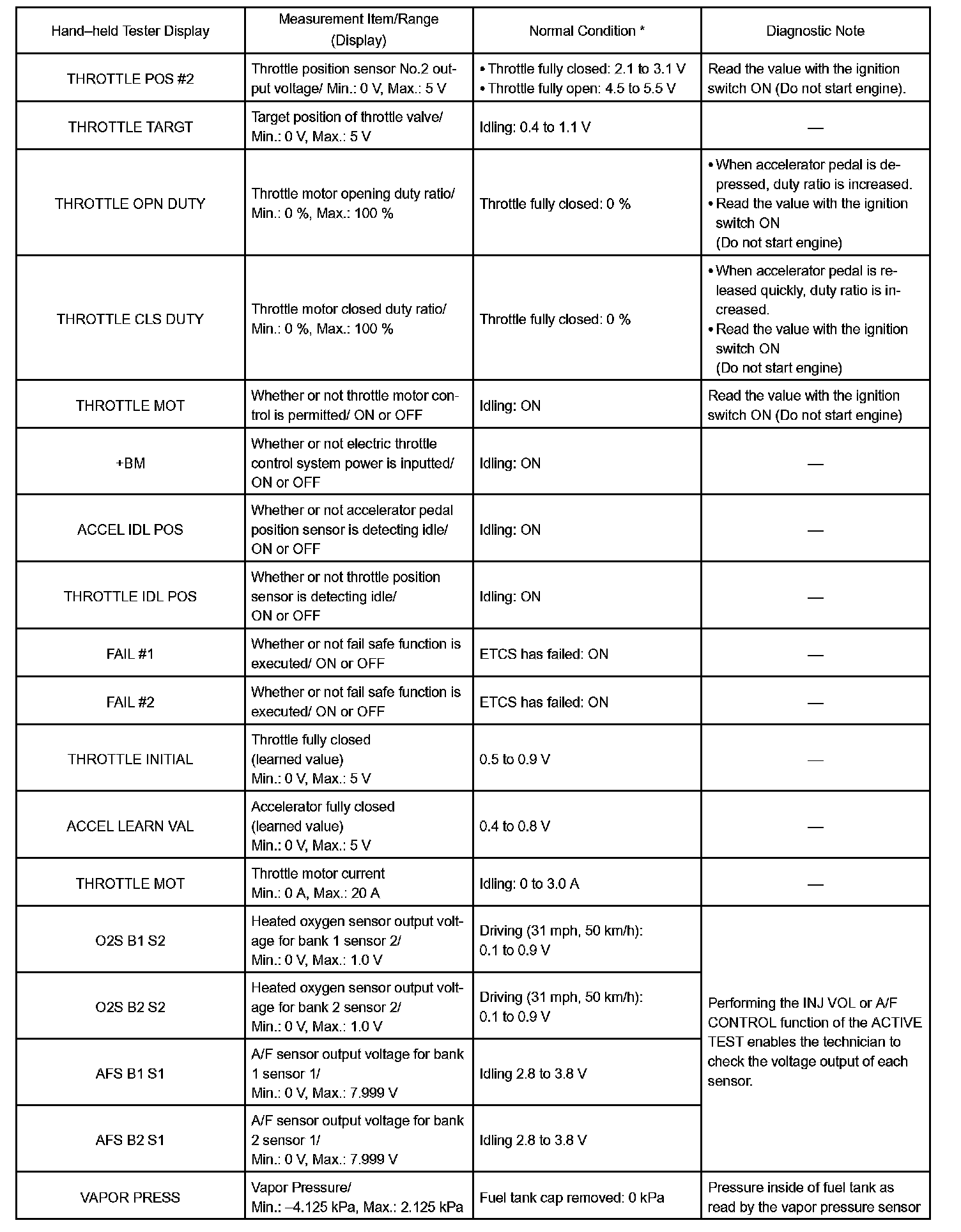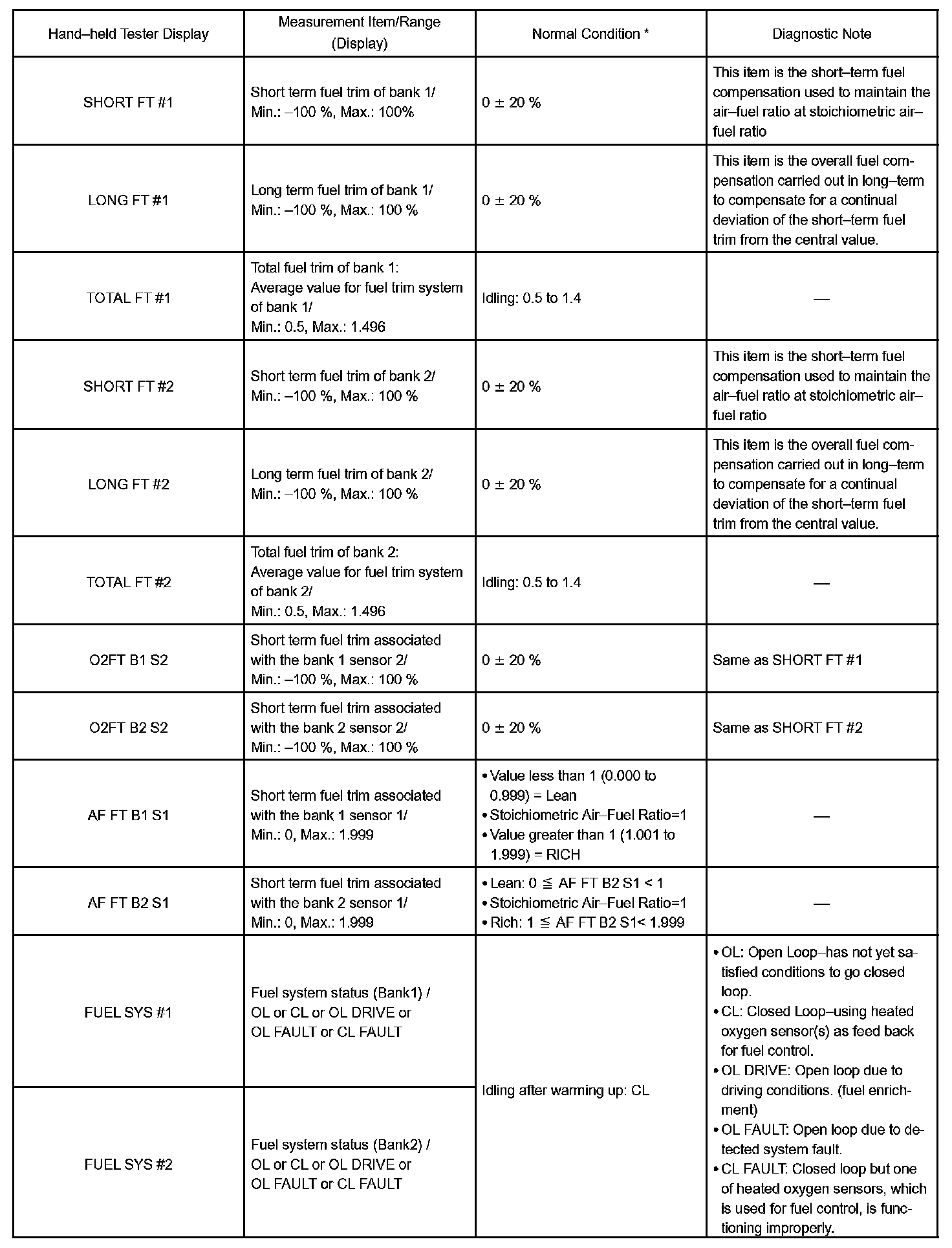 DATA LISTHINT: Using the DATA LIST displayed by the hand-held tester or the OBD II scan tool, you can read the value of the switches, sensors, actuators and so on without parts removal. Reading the DATA LIST as a first step of troubleshooting is one method to shorten diagnostic time.