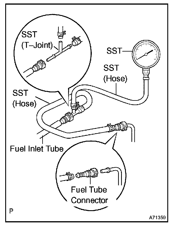 g. Install SST (pressure gauge) and fuel tube connector using SST as shown in the illustration.