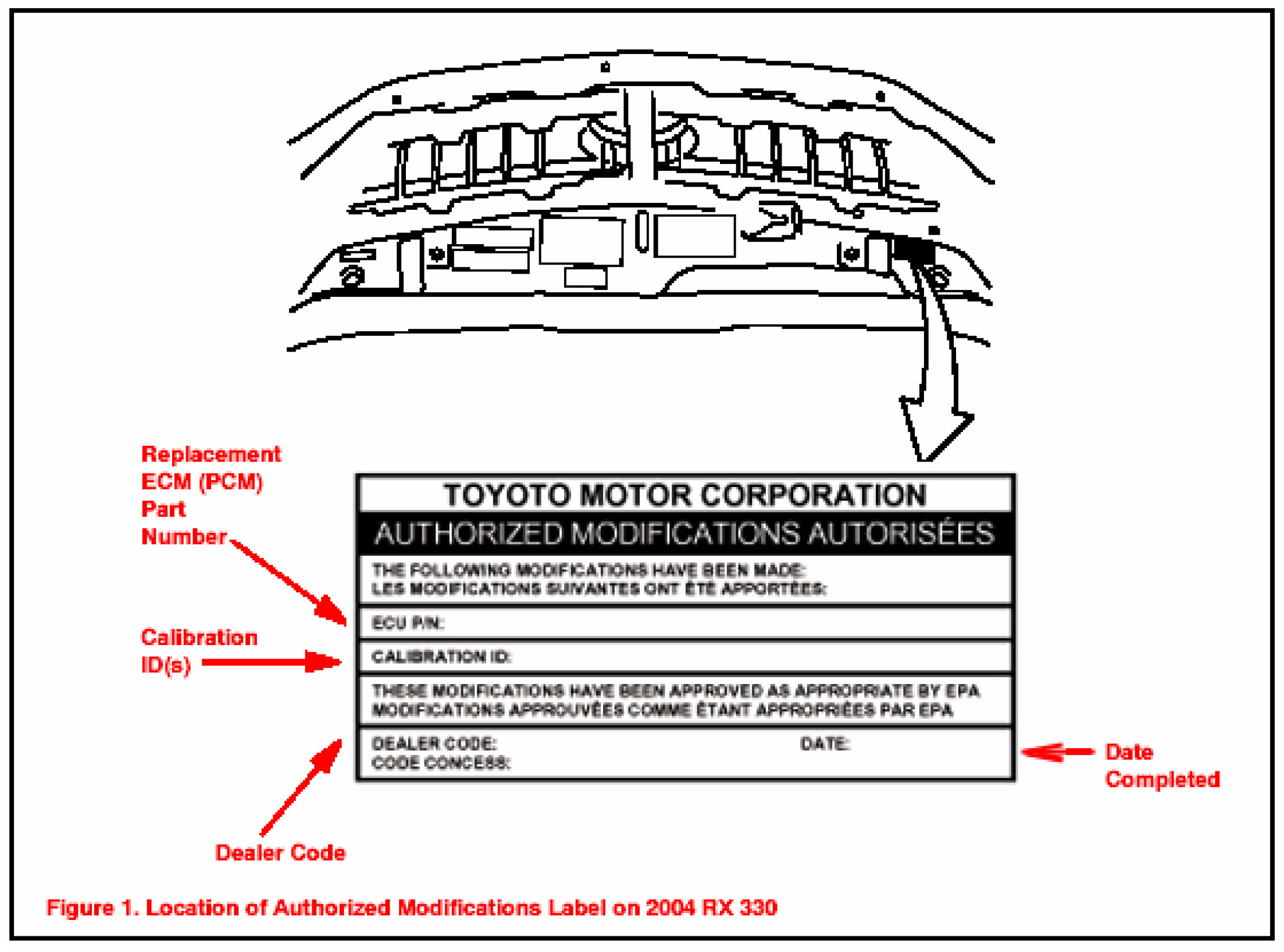 1. Check for the Authorized Modifications Label affixed to the vehicle in the location shown in Figure 1. Confirm if ECM (PCM) calibration has been updated. If not latest ECM (PCM) calibration - go to step 2.