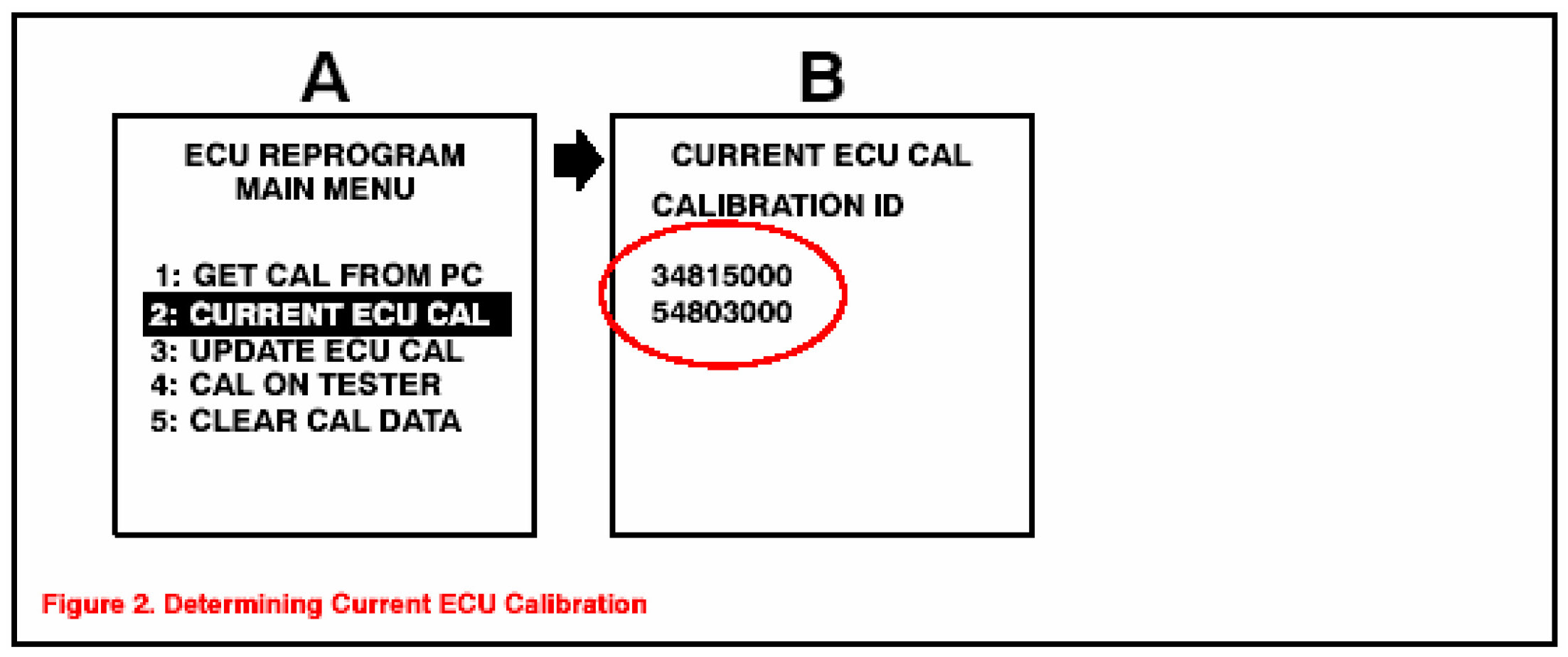 2. Connect the Diagnostic Tester to the vehicle and select CURRENT ECU CAL from the ECU REPROGRAM MAIN MENU. Determine the vehicle's current ECU calibration (see Figure 2).