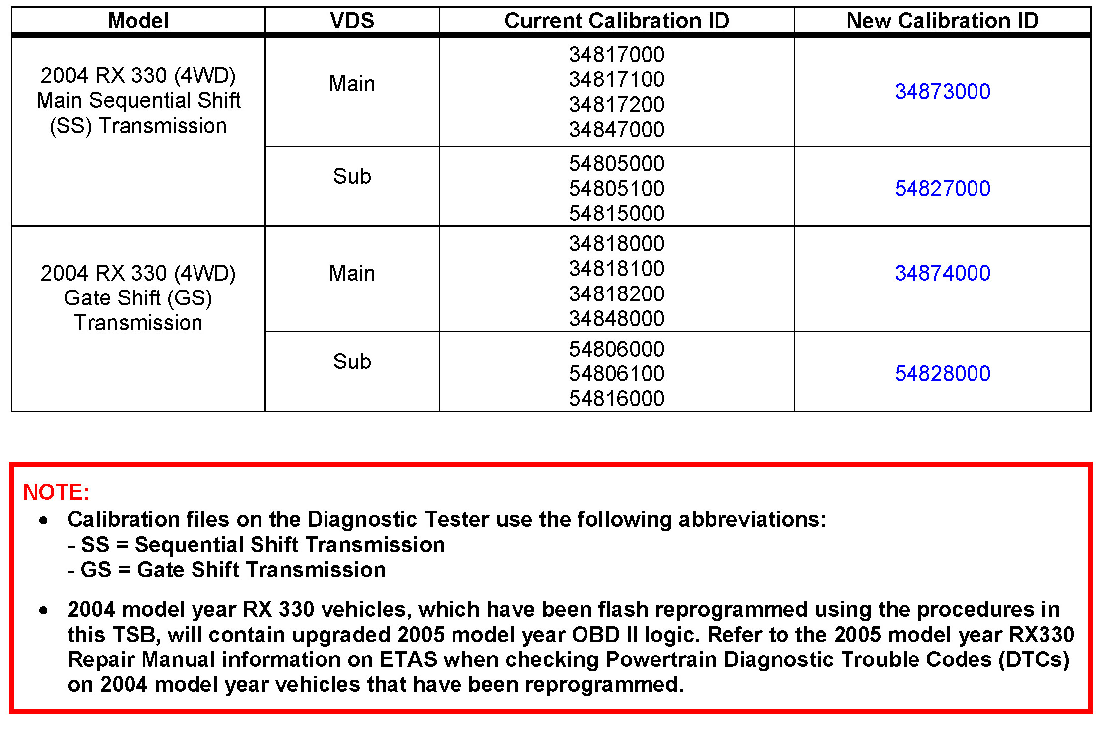 7. For vehicles equipped with laser cruise control, a new Brake Actuator Assembly (with VSC ECU) must be installed at the time of recalibration. If vehicle is equipped with laser cruise, use the Parts Information table to order the correct part and follow the instructions listed on ETAS: 2004 model year RX 330 Repair Manual: Brake: ABS & Traction Actuator Assy: Replacement to replace the Brake Actuator Assembly (with VSC ECU).