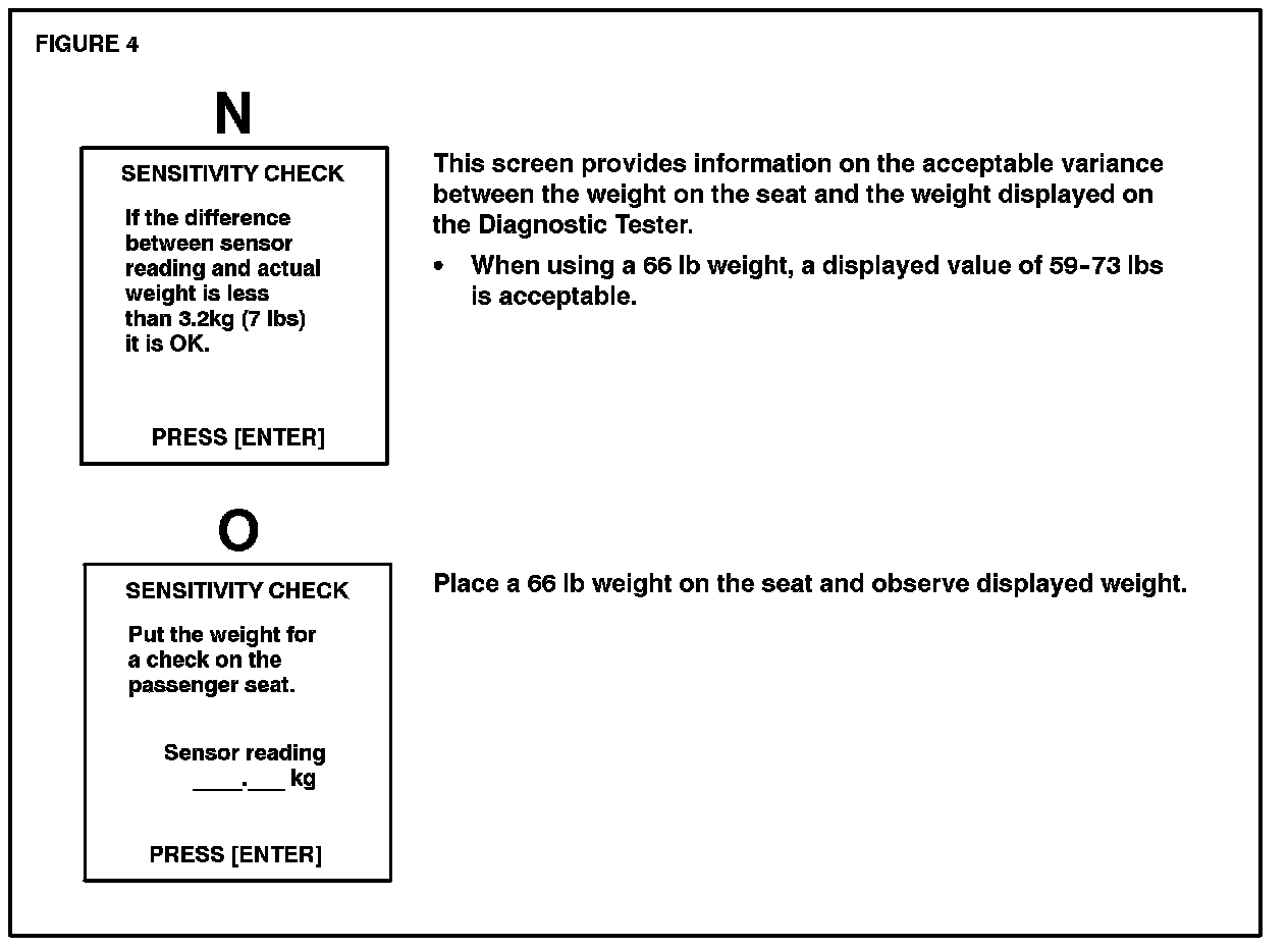 When performing the Sensitivity Check Procedure, make sure the test weights placed on the passenger seat are confirmed using an accurate scale. This is necessary to ensure proper system diagnosis.